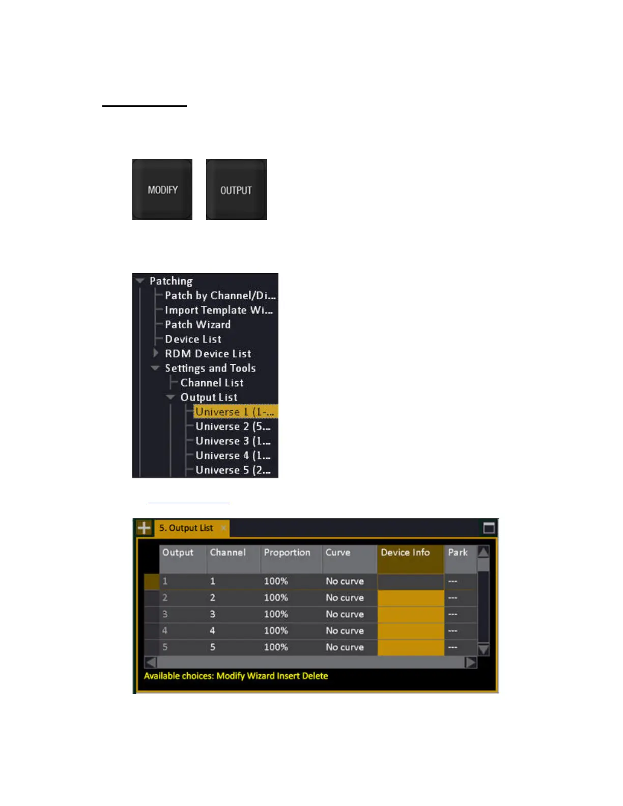 >Patching >Output List >Universe #).