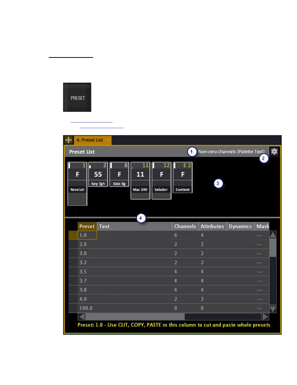 Press PRESET to open the Preset list, which is a spreadsheet view of all presets in your play. You can