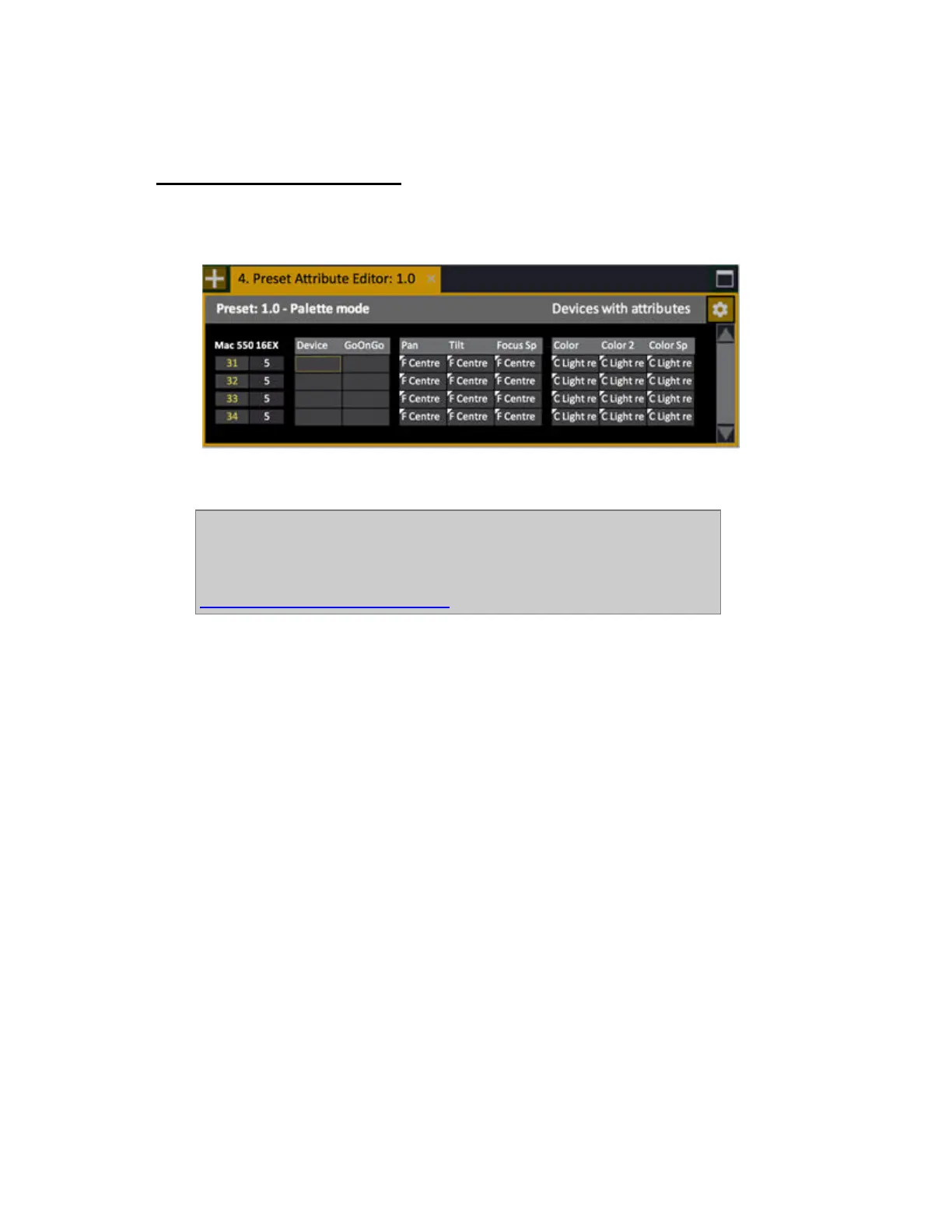 You can view and edit all device parameters for a Preset in the Preset Attribute Editor (# PRESET &