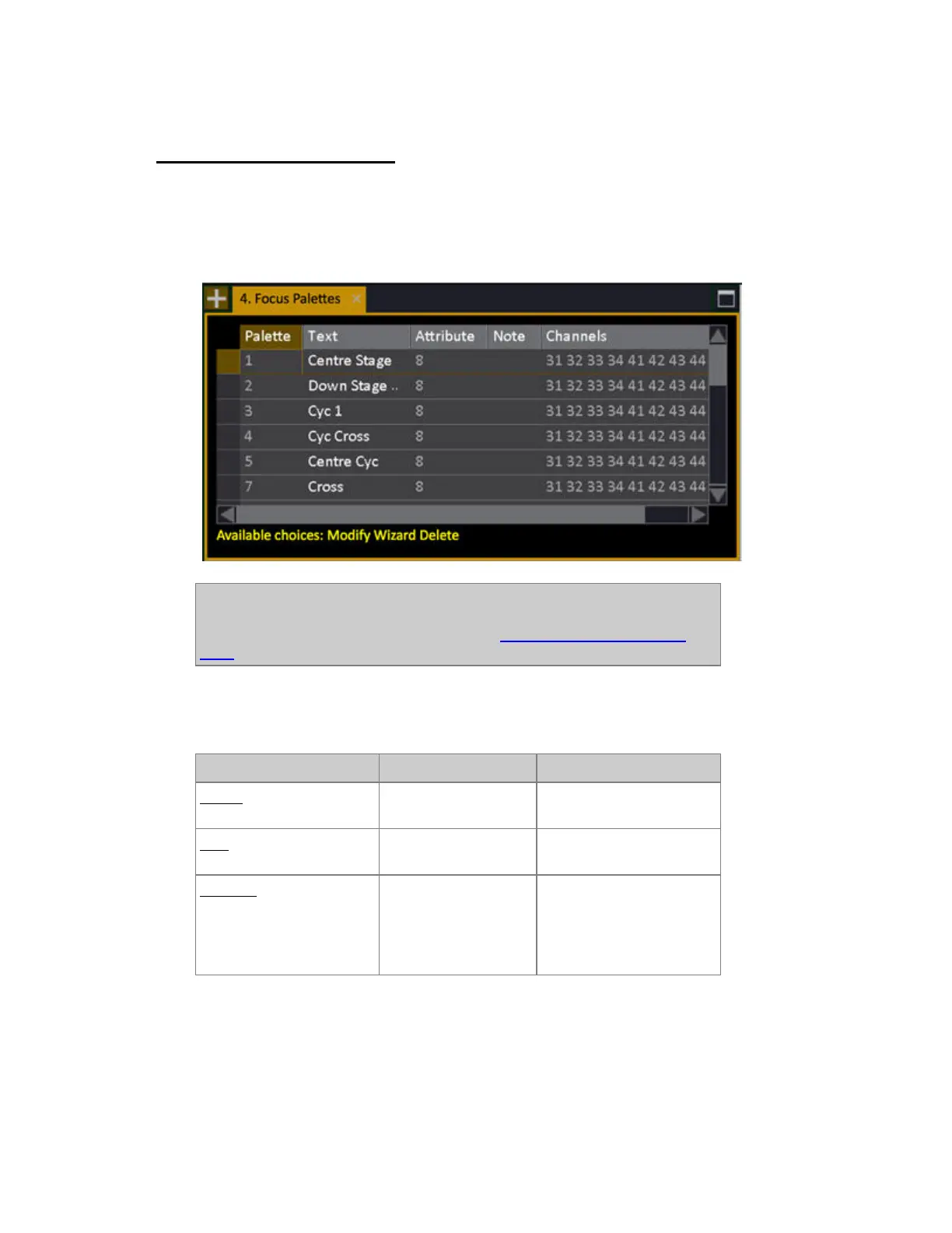 Hold MODIFY and press FOCUS, COLOR, BEAM or PALETTE to open a Palette list where you can