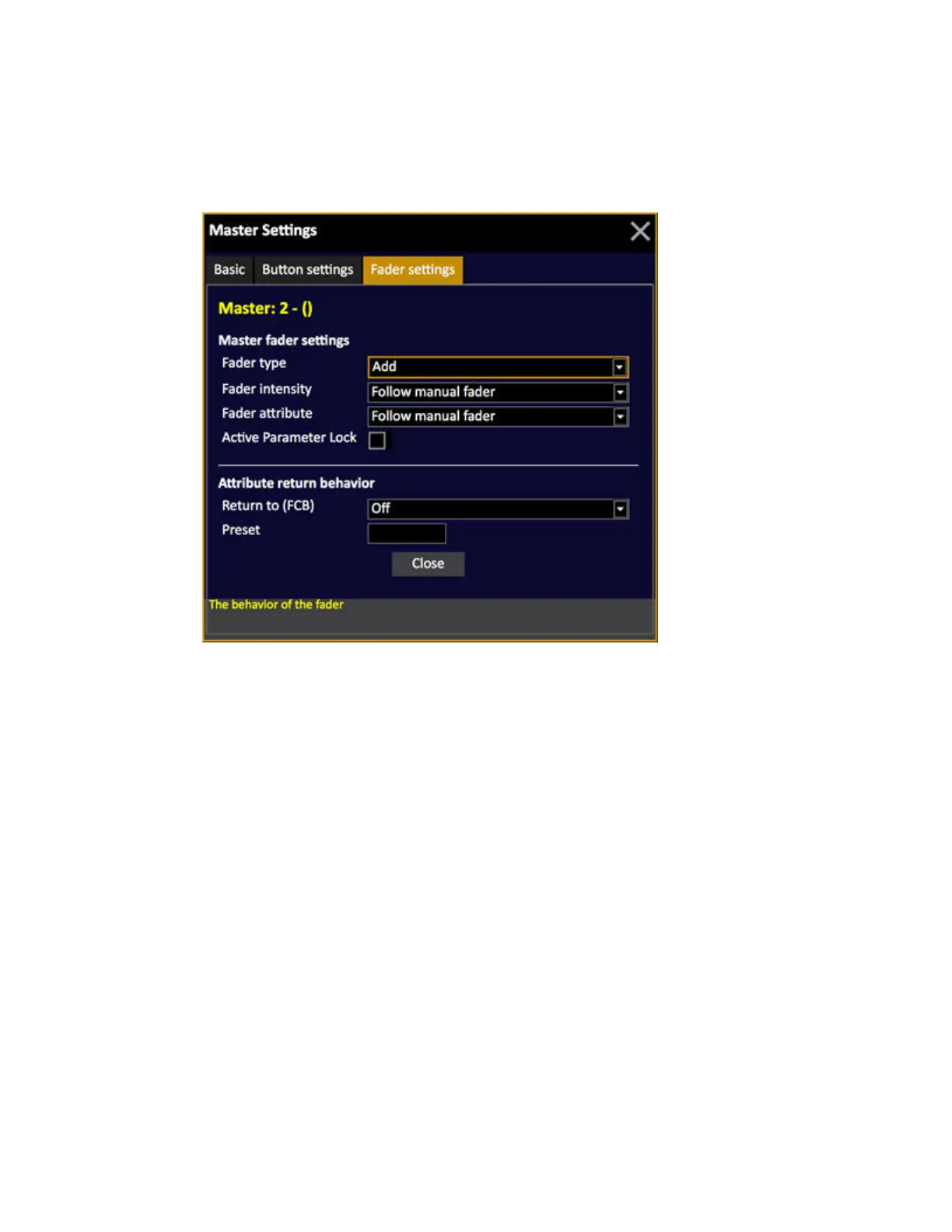 The fader settings define the behaviour of intensities and attributes for the fader. The different modes