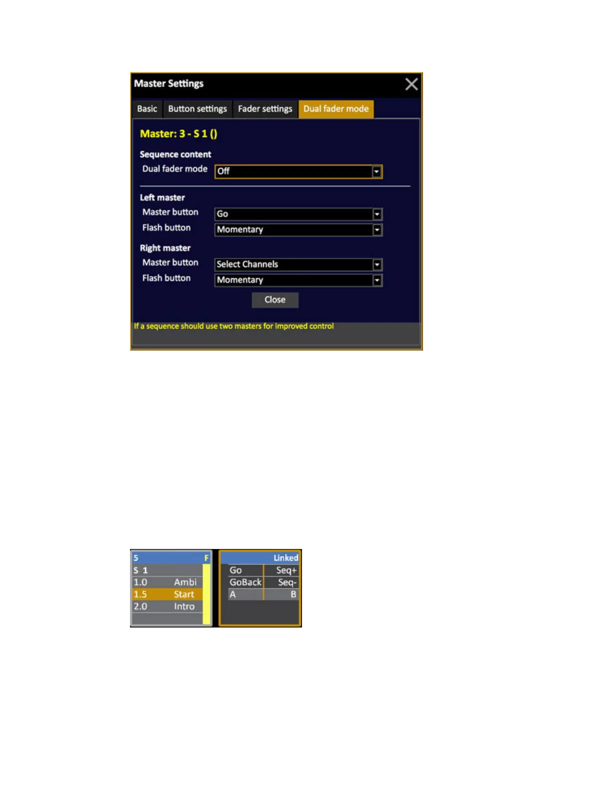 The first master controls the intensity of the sequence, and the second is a combined A/B crossfader.
