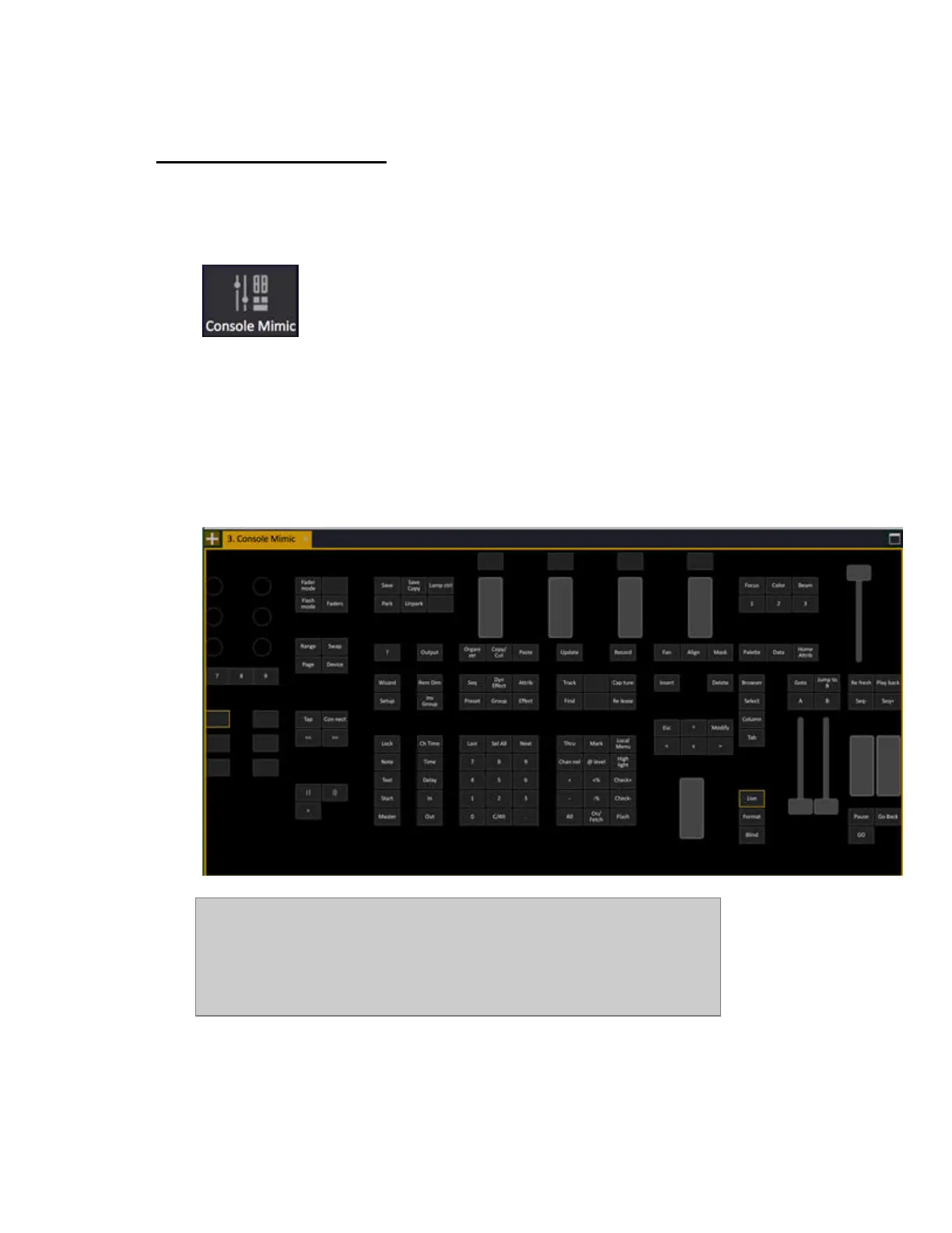 • Click on a button or fader to press or move. Pressed button is indicated with a yellow