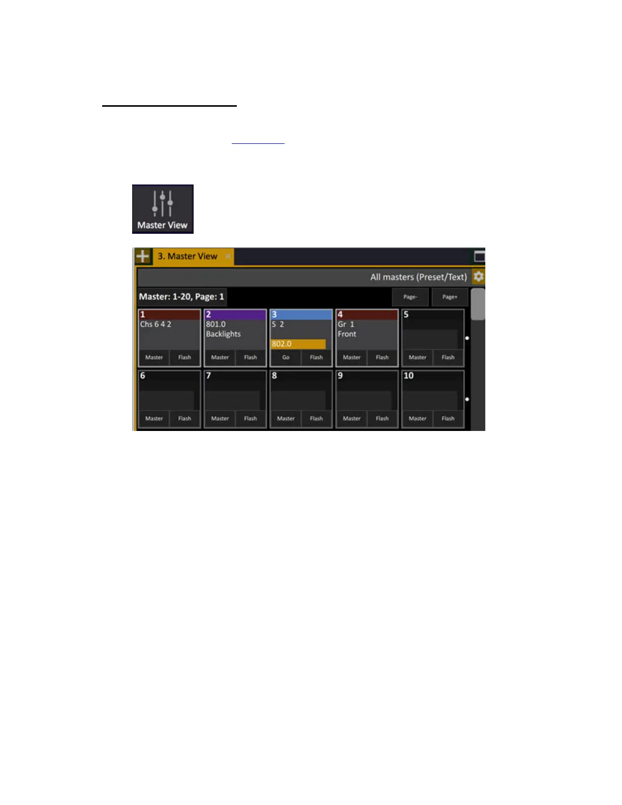 The Master View shows all masters . You can view and select masters, set levels and drag channels