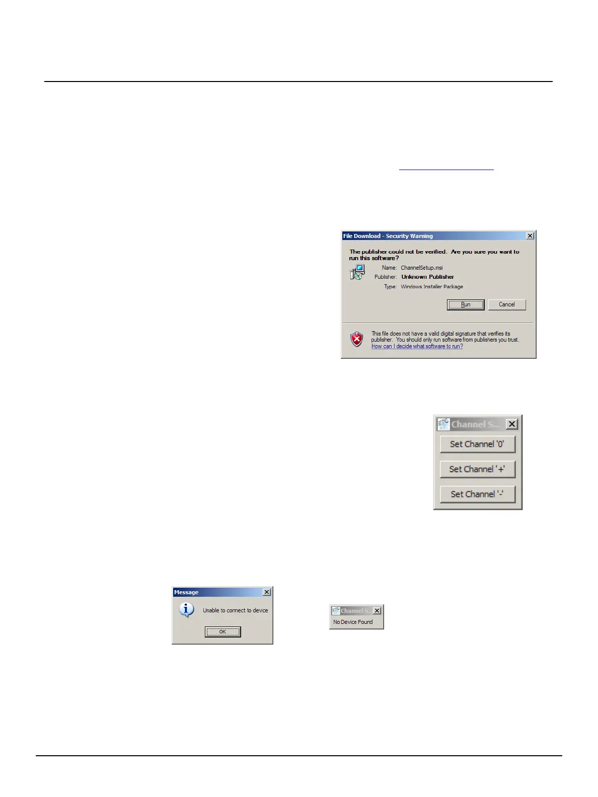 If you receive the error prompts shown below, instead of the Channel Setup Window, the