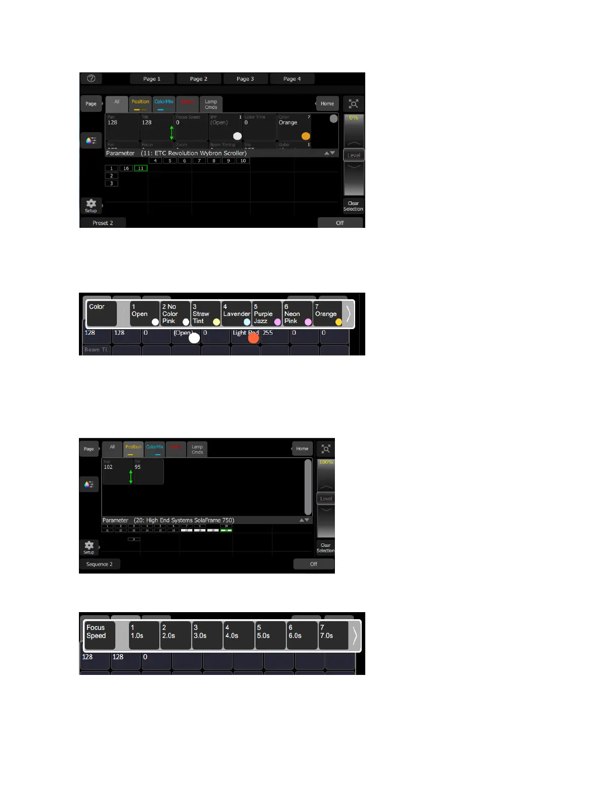 Show only the position parameters, pan and tilt. There are two pages of pan and tilt controls. The first page dis-