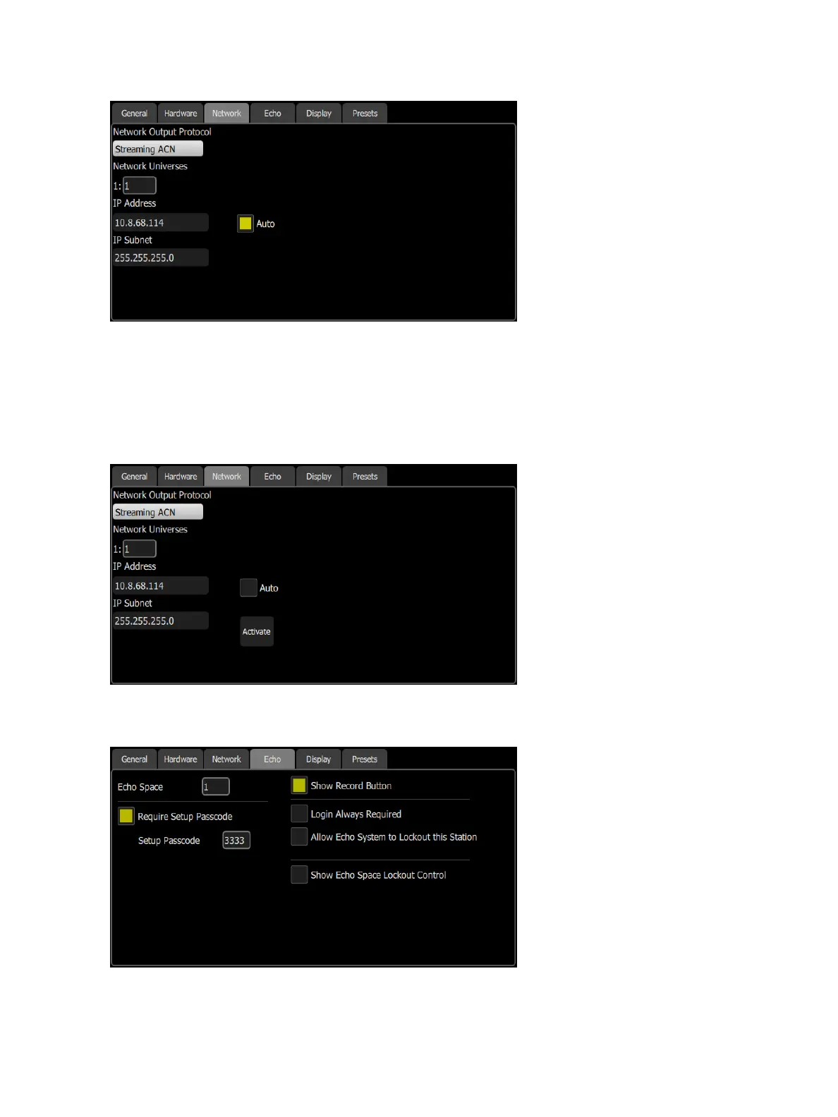 If Auto is disabled, you will need to set the desired IP address and subnet. After you set those, press the Activ-