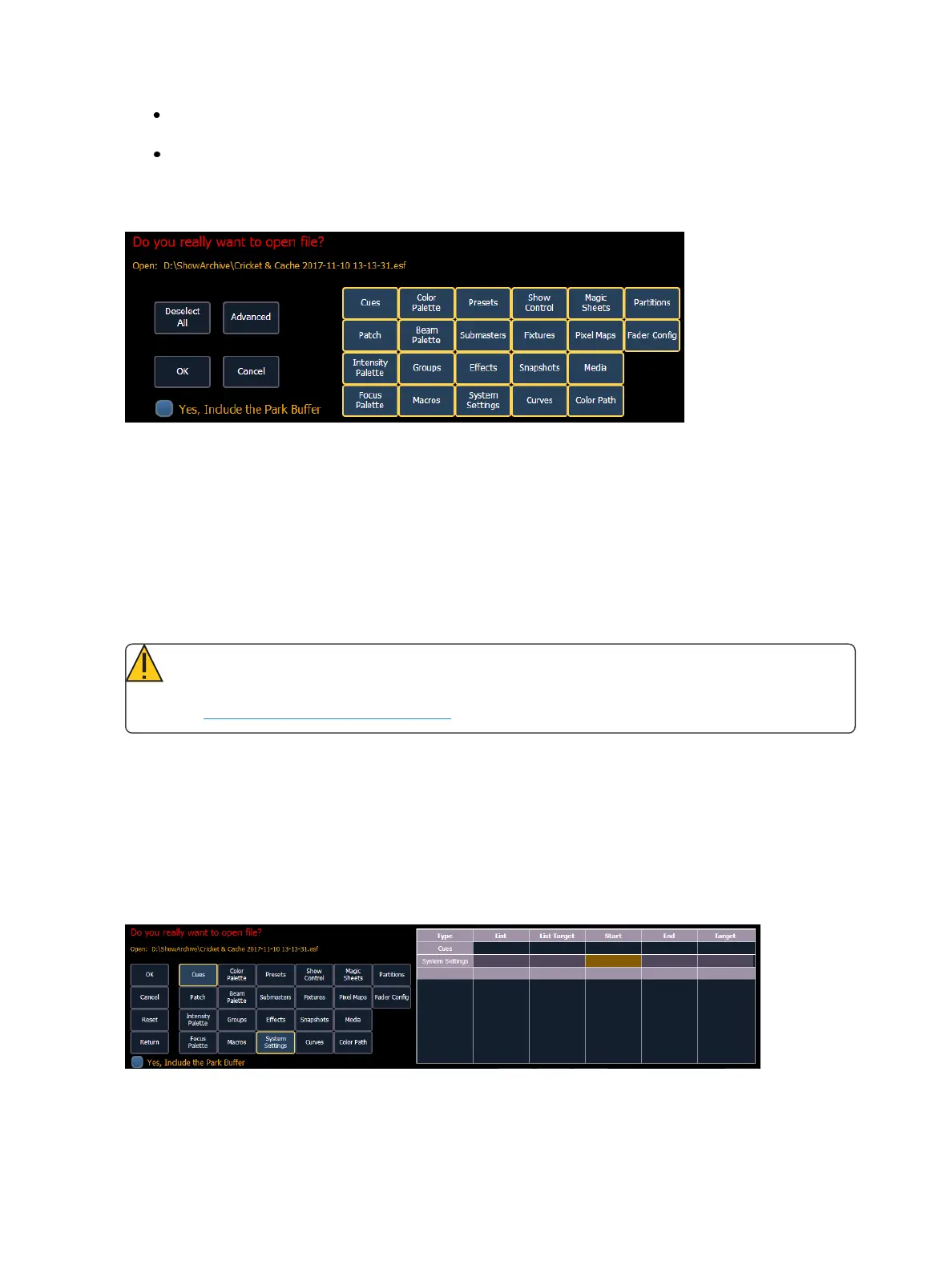 From this screen you can select which components of the show file you wish to load. The buttons at