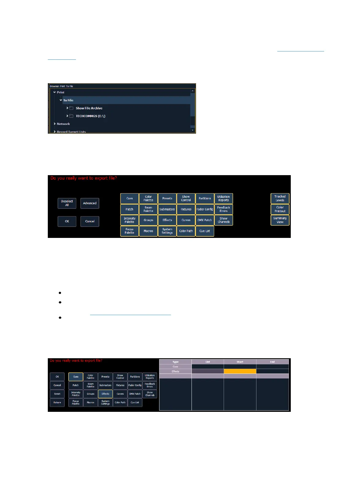 Color Printout - prints the cue data using the same color indicators as the console's displays