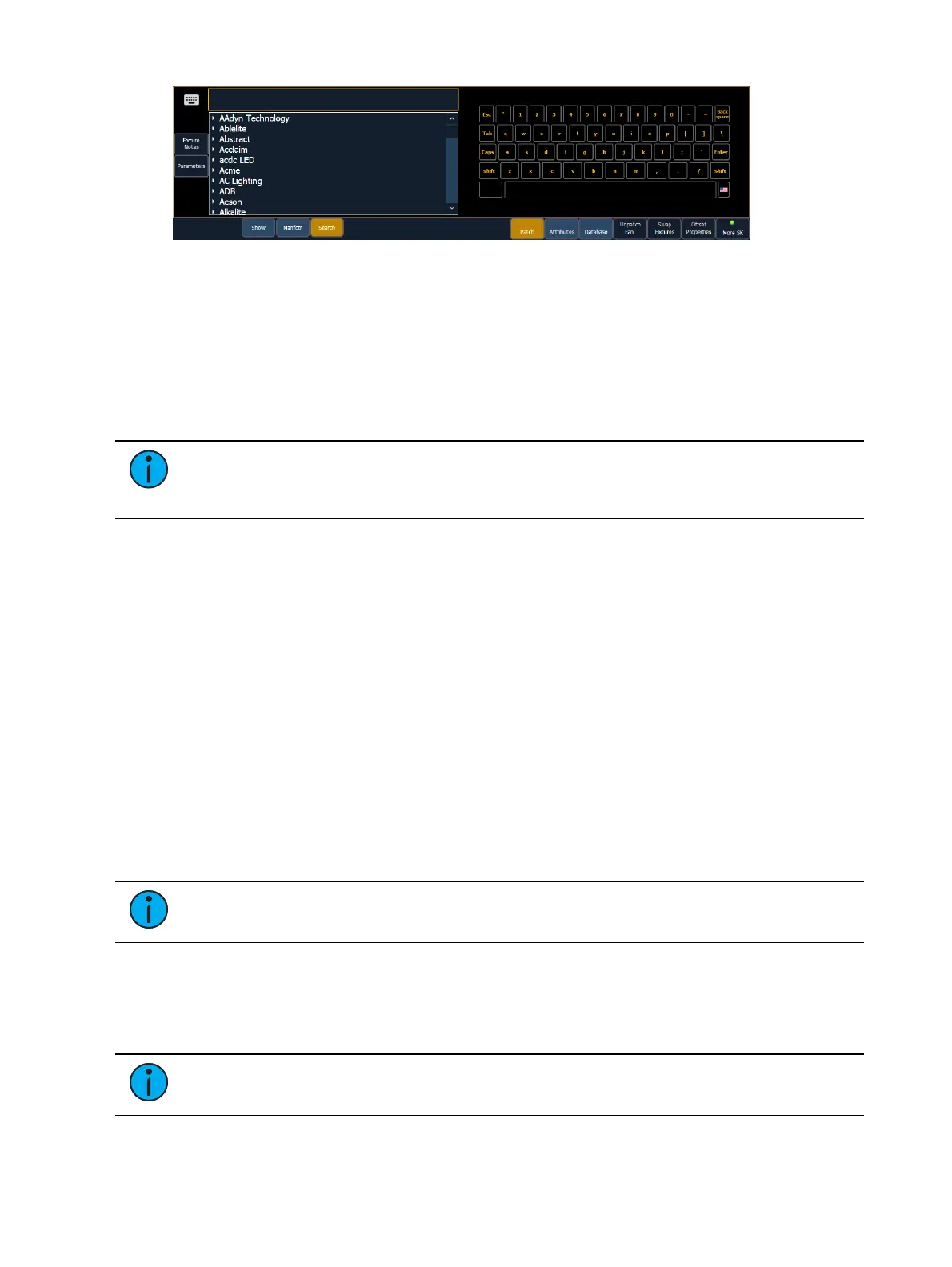 In the search window, press {Parameters} to view a parameter list for a fixture, or press {Fixture
