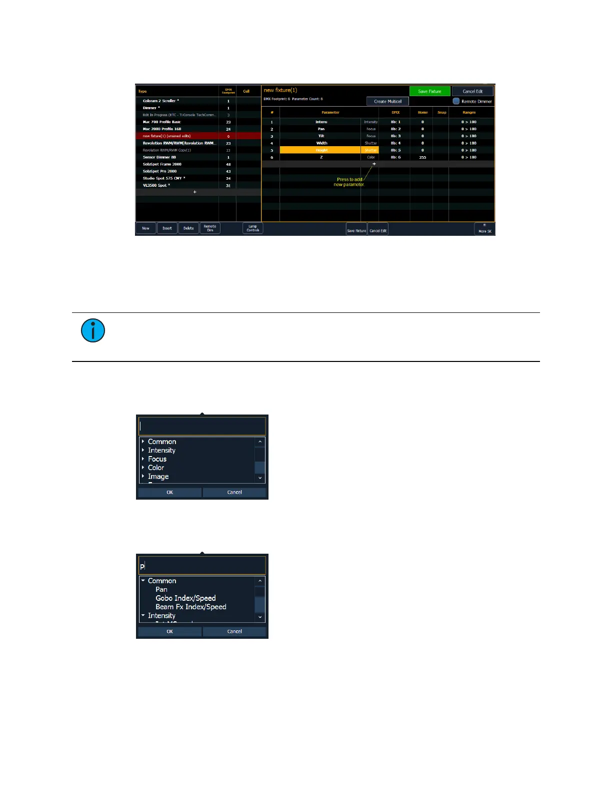 1. Use the [Page] keys, mouse, or touchscreen to select the new fixture.