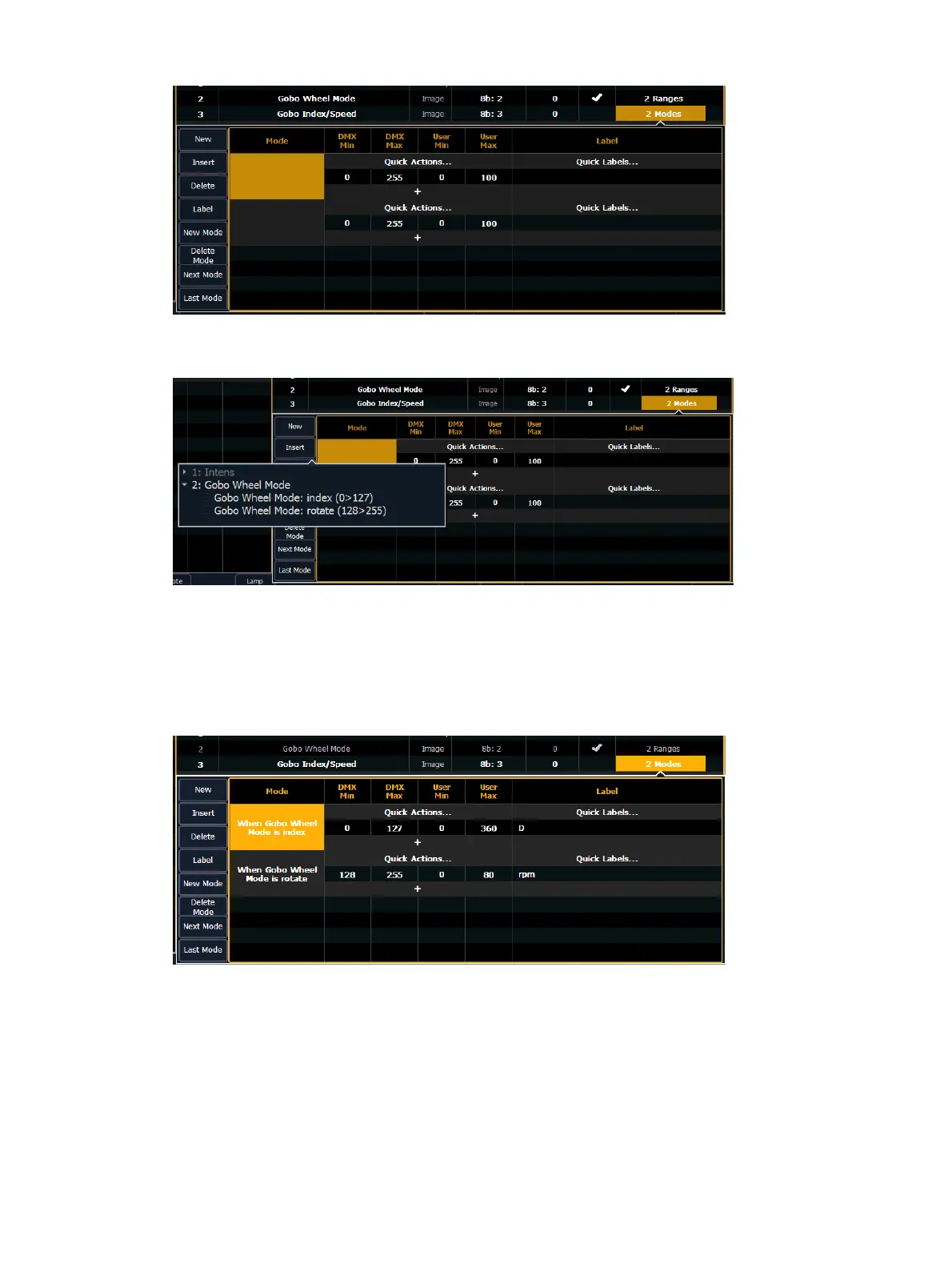 Assign the DMX and user values. The range values were used for the DMXvalues. For index, the