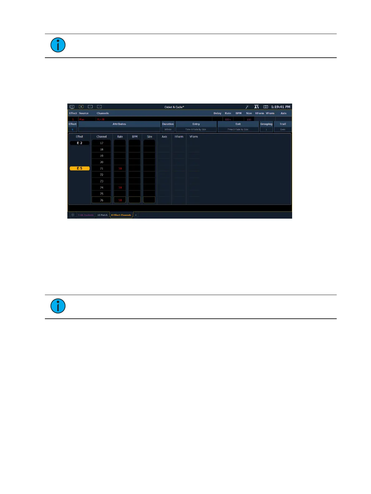 In the Effect Channels Display, you can override certain effect properties per channel at the cue