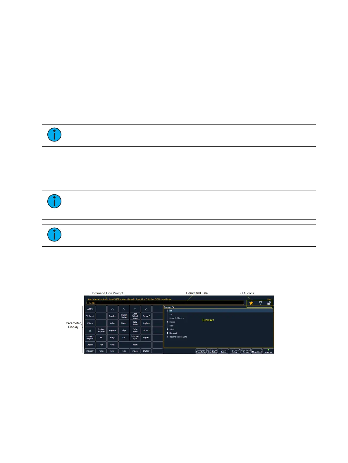 consists of three primary areas: the command line, the parameter display, and the browser.