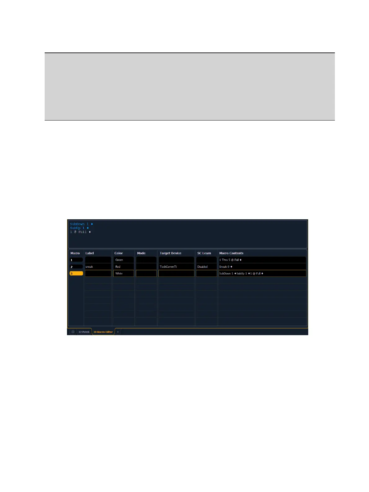 The display is divided horizontally, the top portion displays the macro contents in detail while