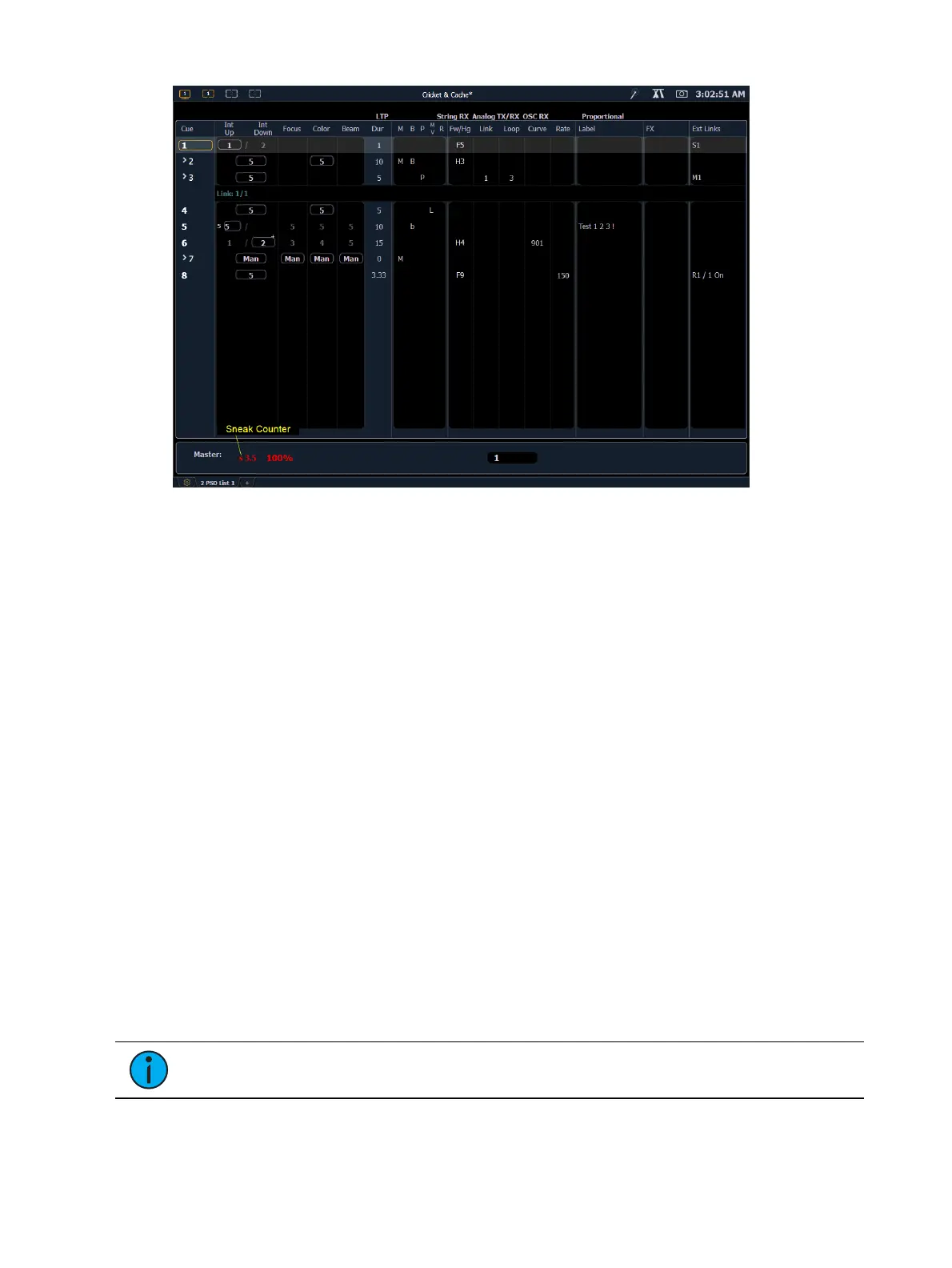 P (see cue 3) - Indicates the cue will preheat. Found in the cue display “Flags” area.