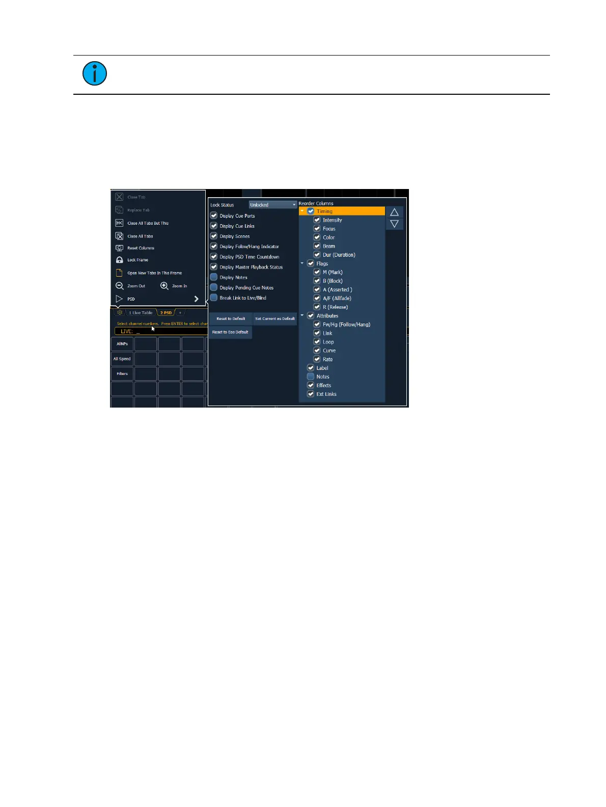 Lock Status - allows you to lock the PSD to a certain cue list. When the PSD is split, you
