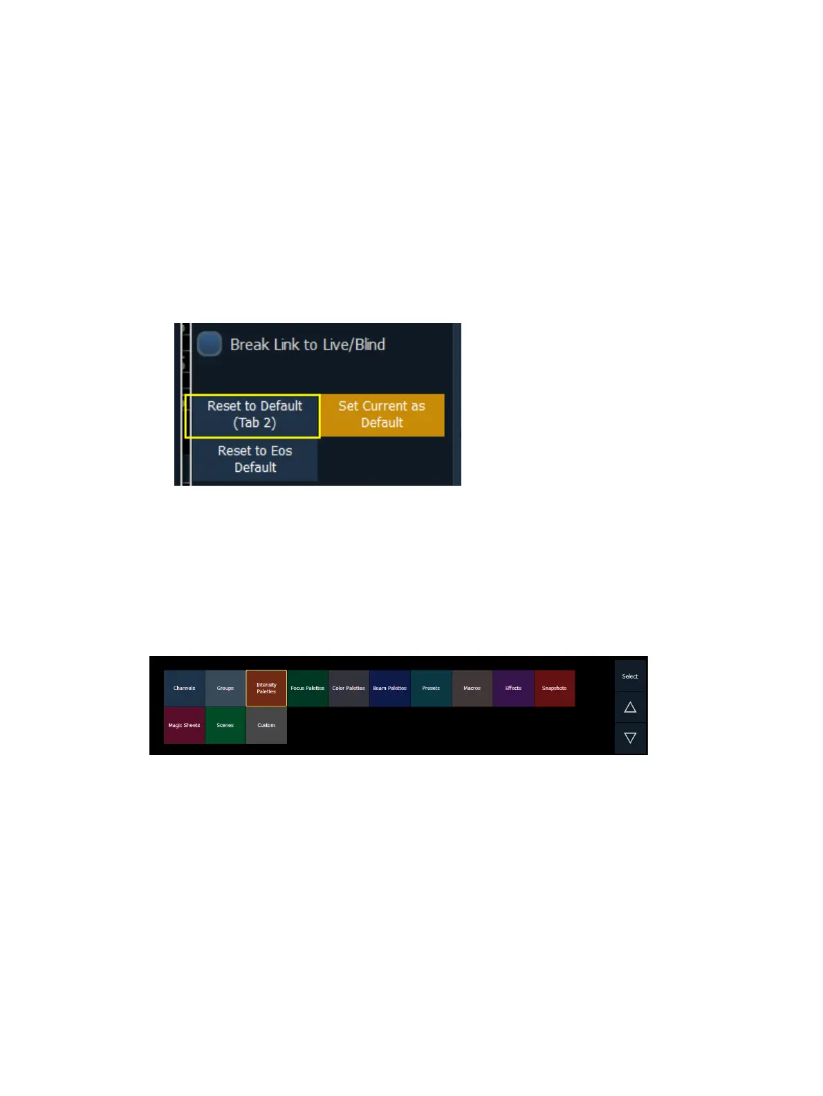 Reset to Eos Default - returns all settings to the Eos defaults.