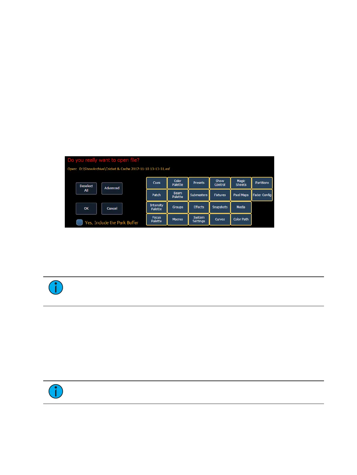 If the loaded show file exceeds the console’s output capacity, an advisory will display in the CIA.