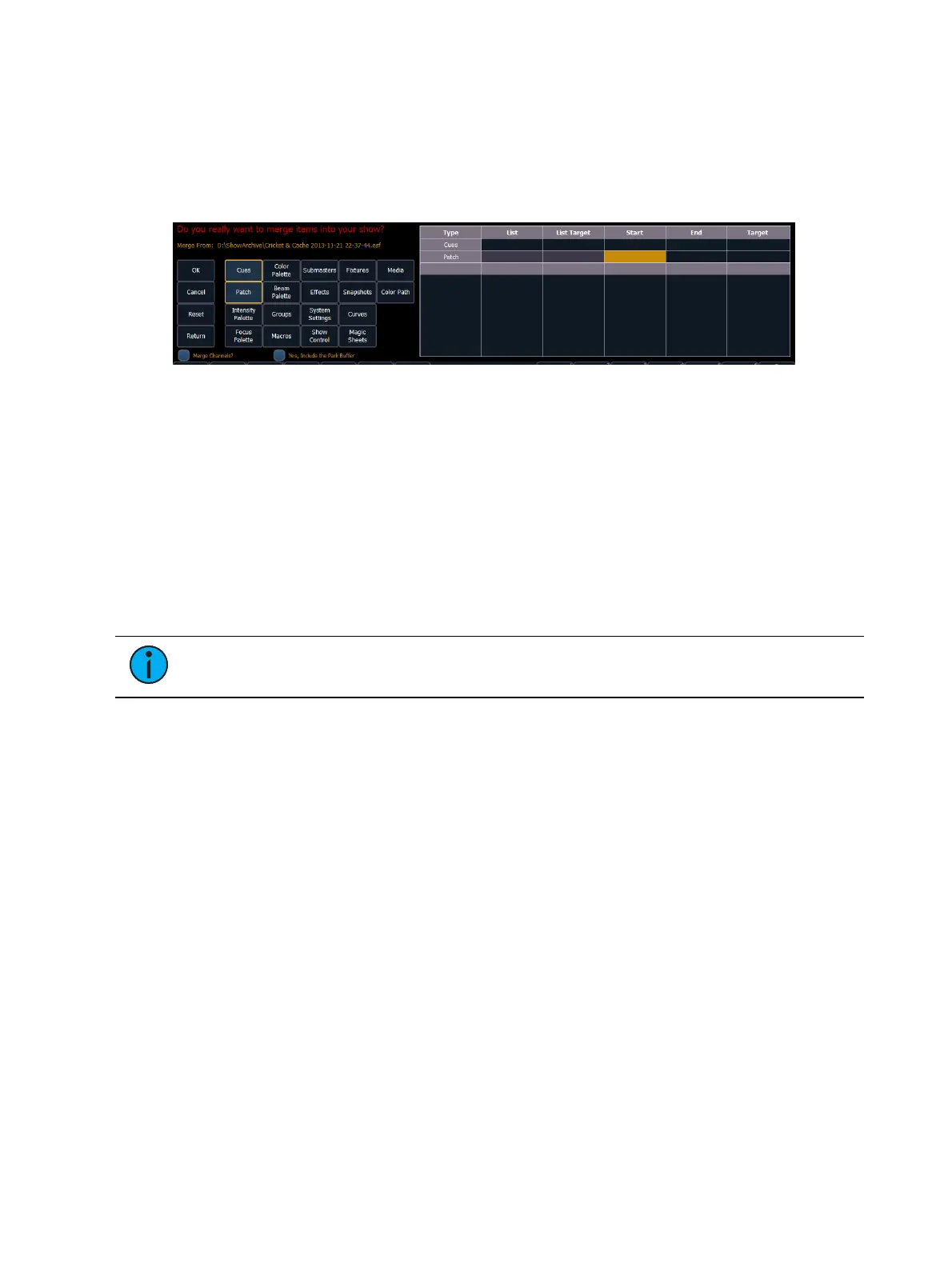 You have the option to selectively merge partial patch information or fixtures into a show file by