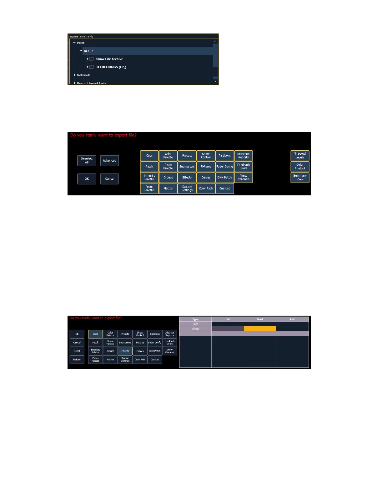 Color Printout - prints the cue data using the same color indicators as the console's
