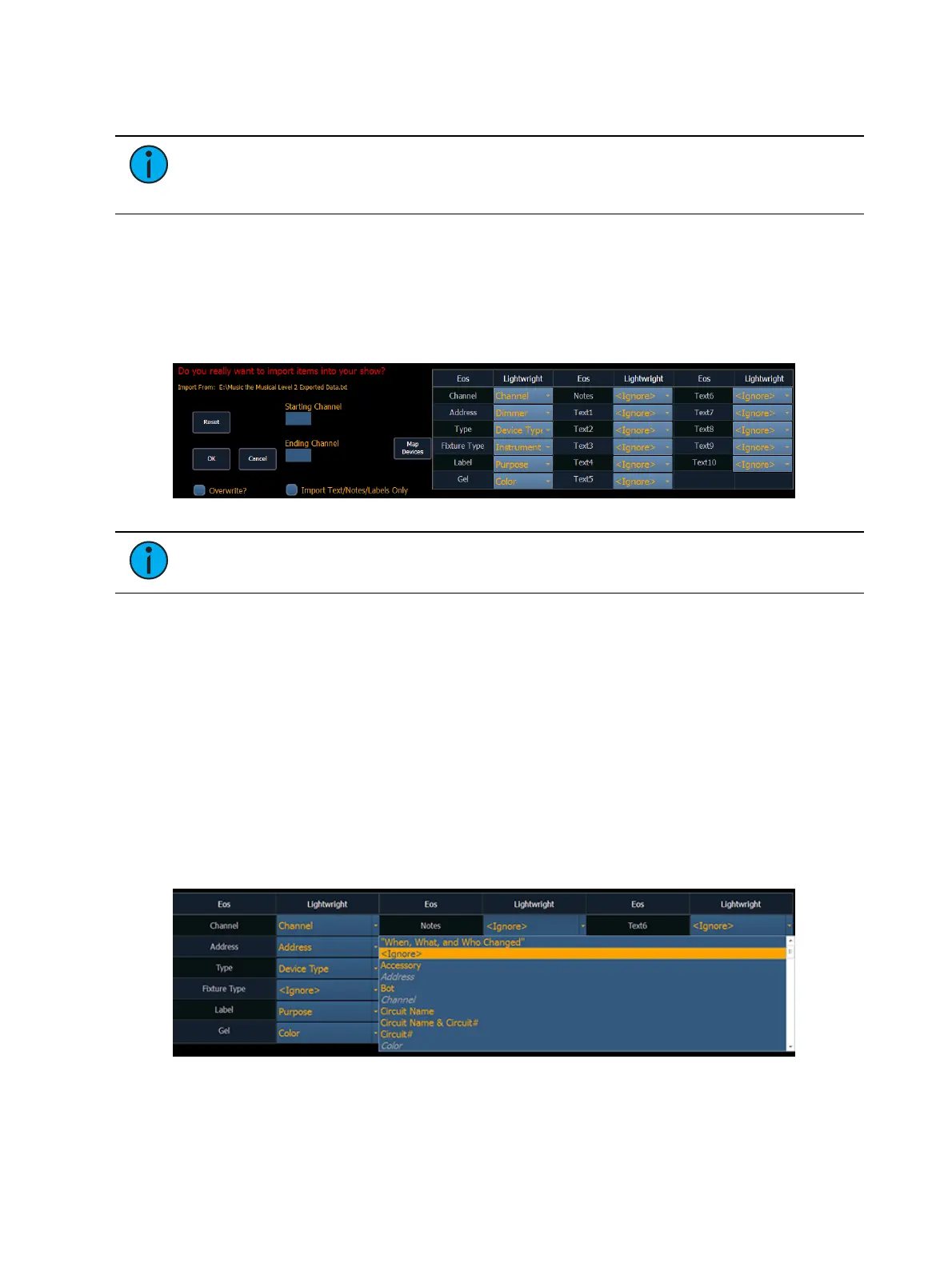 You can map Element patch fields to fields in the Lightwright file. Channel and Address must be
