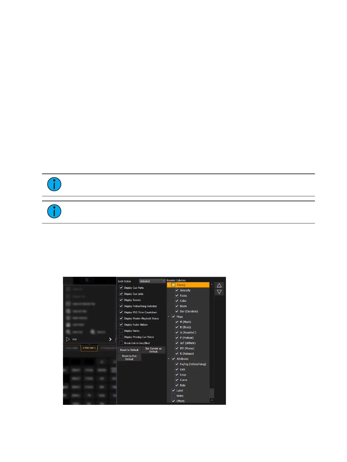 P (see cue 3) - Indicates the cue will preheat. Found in the cue display “Flags” area.