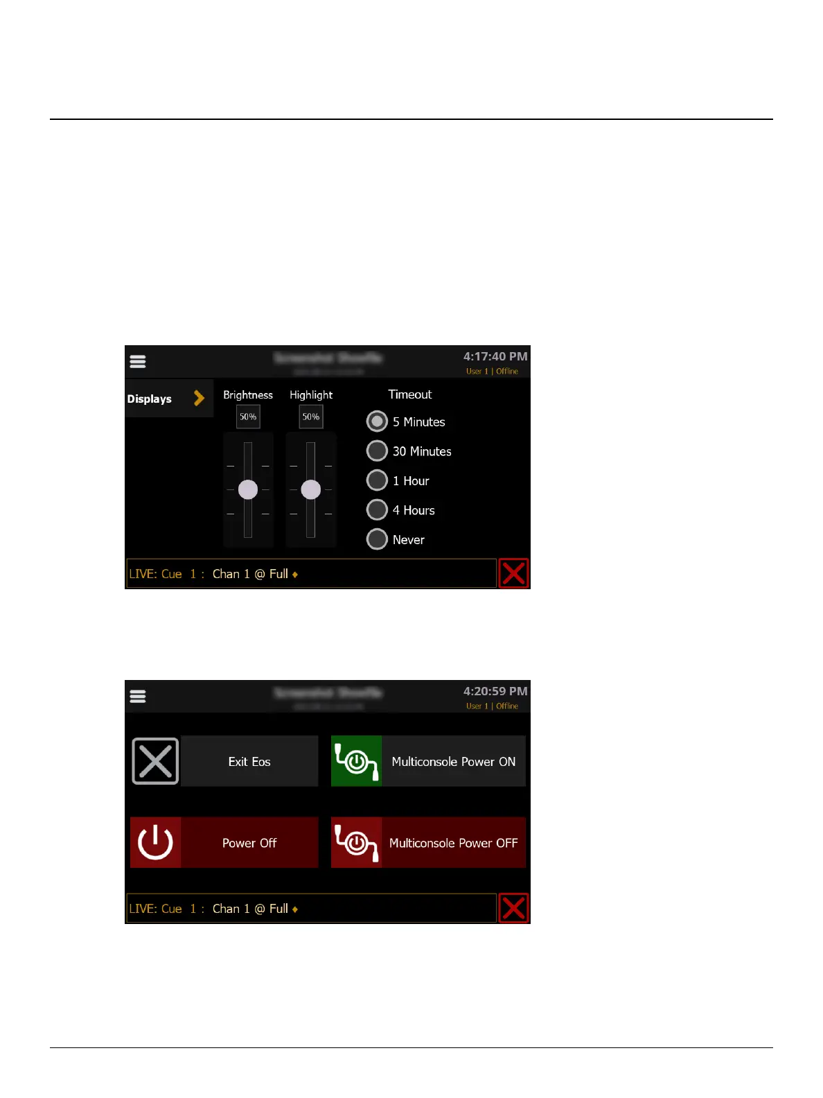 This sub-menu gives you options to exit the Eos application, physically power off, and remotely