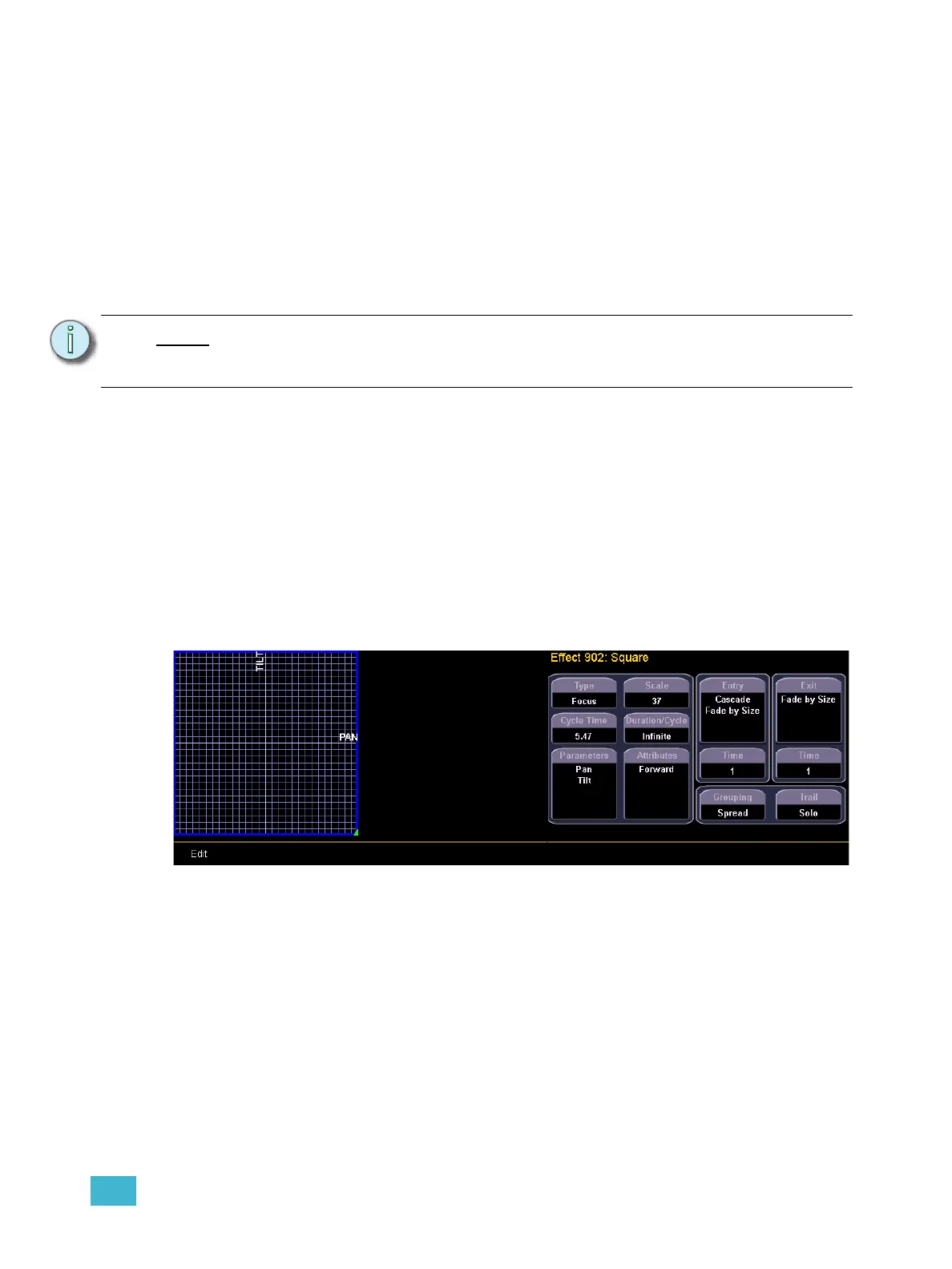 Focus effects are designed to impact a channel’s pan and tilt parameters. These are represented in