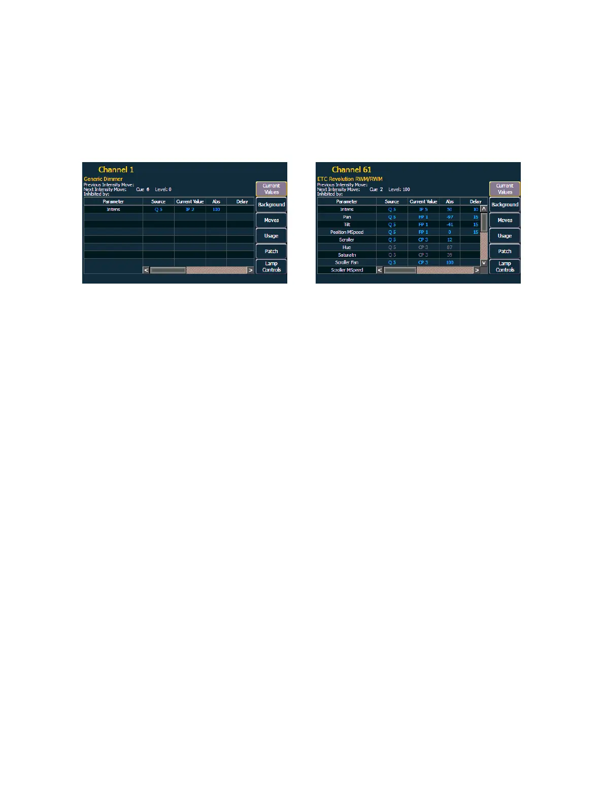 Moving Light Channel Current ValuesConventional Channel Current Values