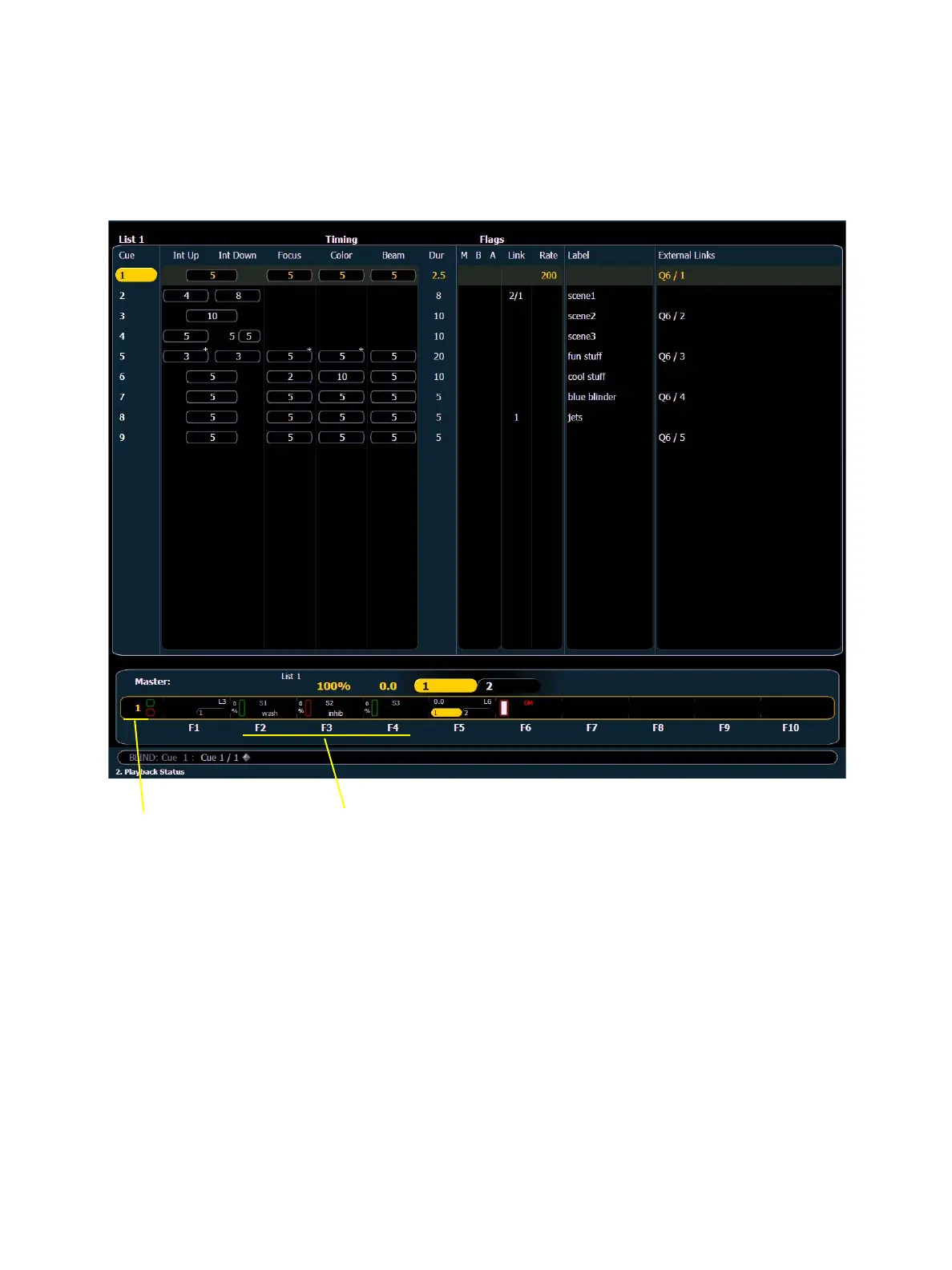 list, the view of the active cue list increases to the full size of the display. The current fader page is