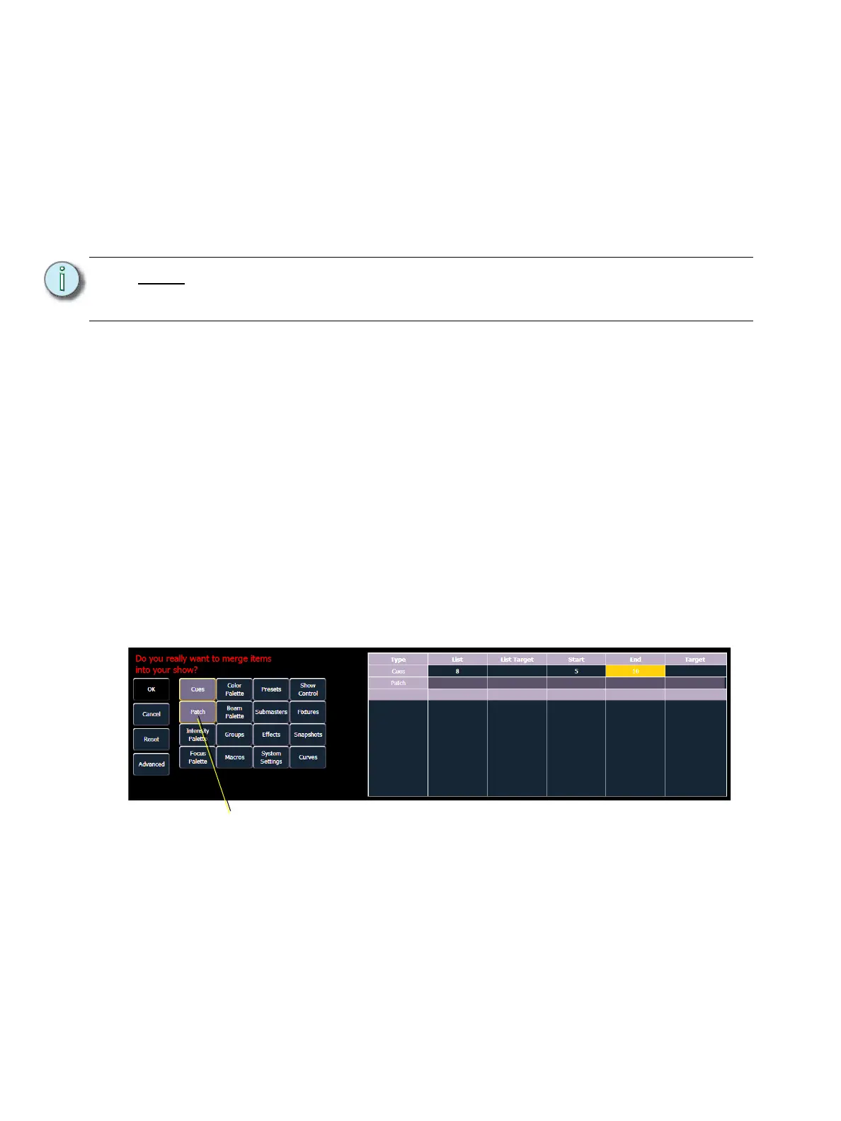 see the complete list of show components, press the {Advanced} key in the merge show loading