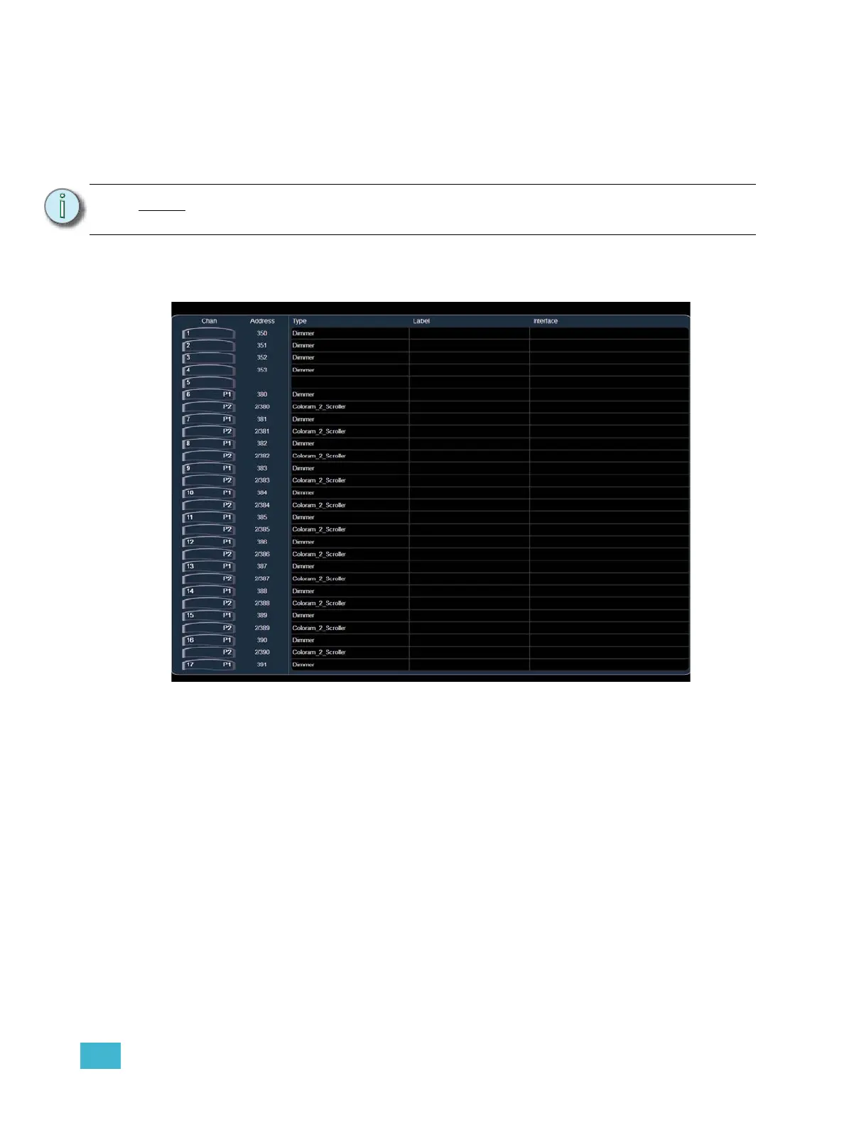 channels are sorted numerically with the DMX address in the second column. In the “patch by