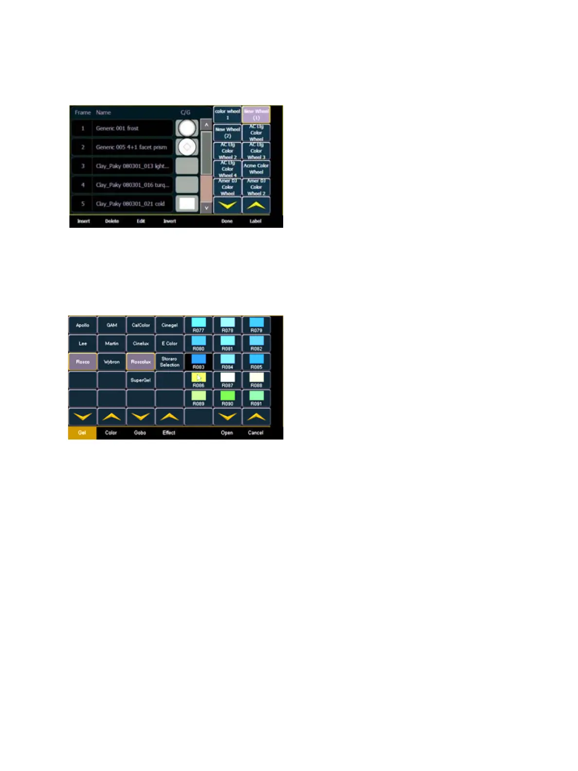 • {Gel}, {Color}, {Gobo}, and {Effect} - each will