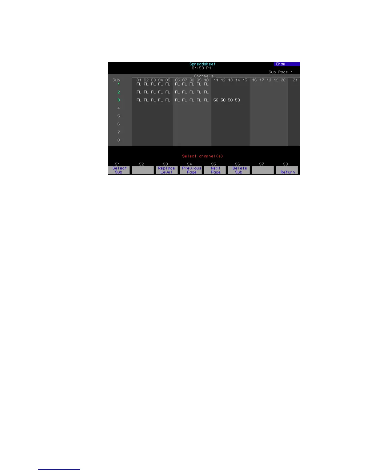 Press [Blind] [Sub] [S3[, Spreadsheet, to go to the submaster
