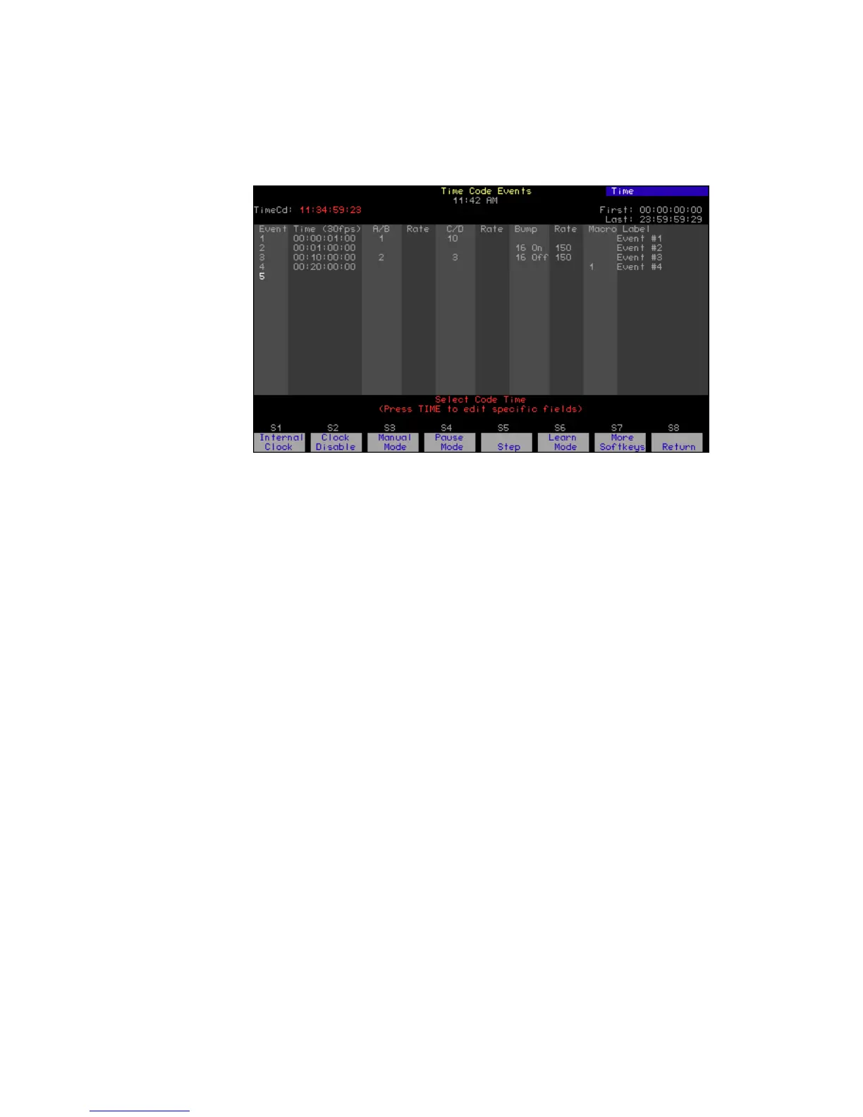 Events display, press [Setup] [1][3], Time Code Events, [Enter] [Enter] to
