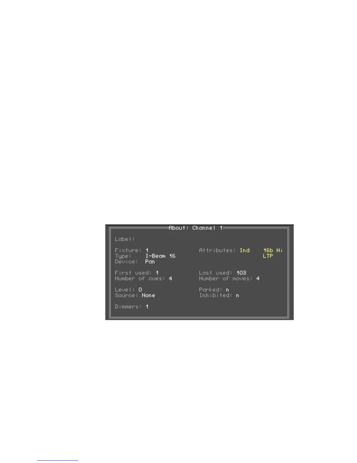 Following is an About Channel display for a channel patched to a fixture