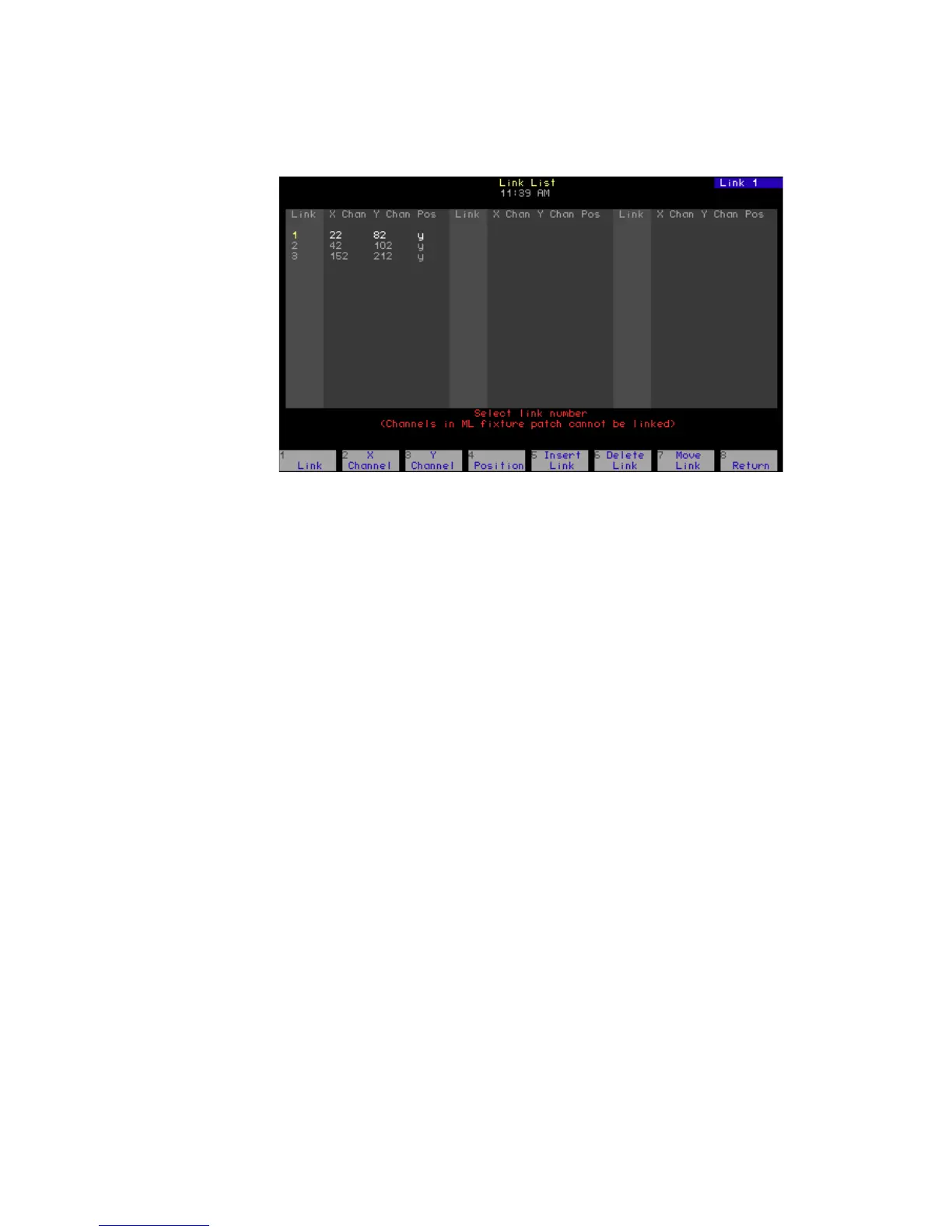 Press [Setup] [1][1], Channel Attributes, [Enter] [S7], Link List, to reach