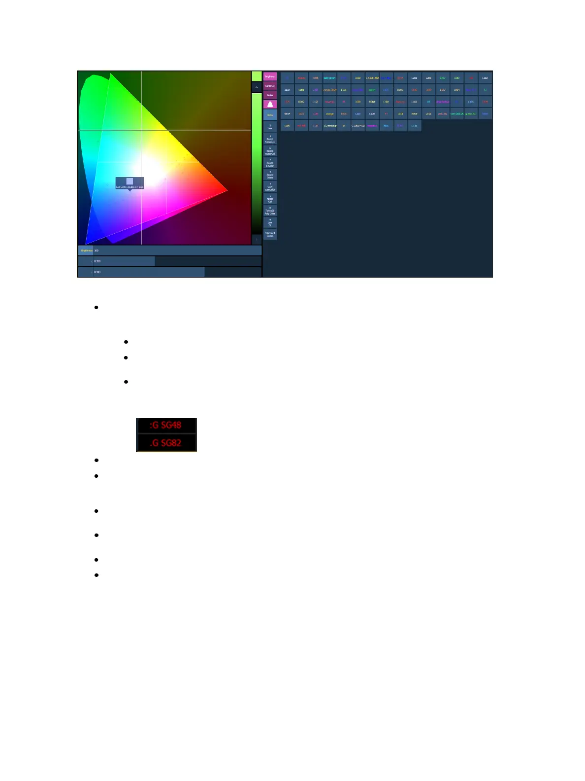{Similar} - will show gels that are in the same selected area of the color picker. Only gels in the