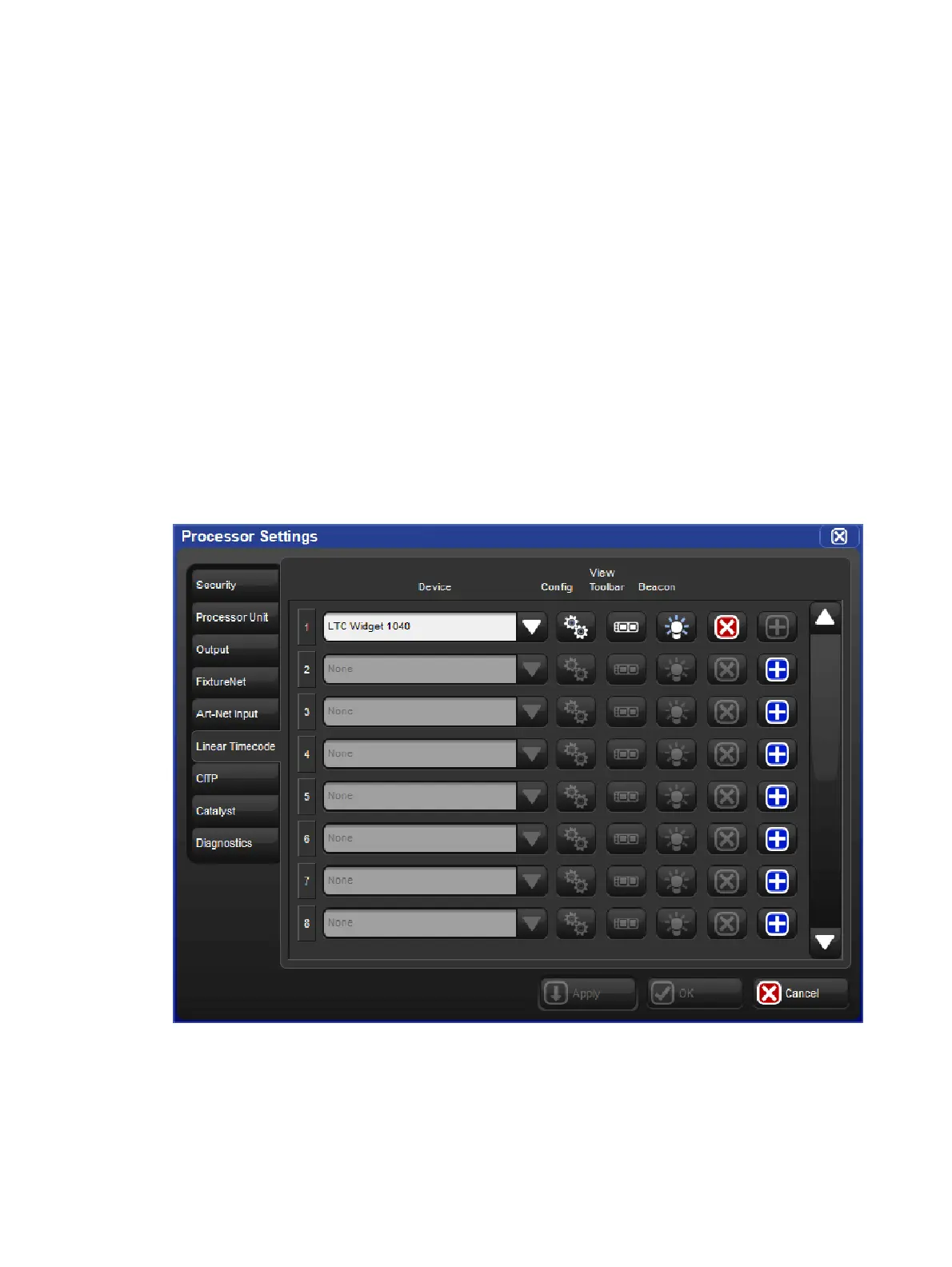 5. Select the Linear Timecode tab in the Processor Settings window.