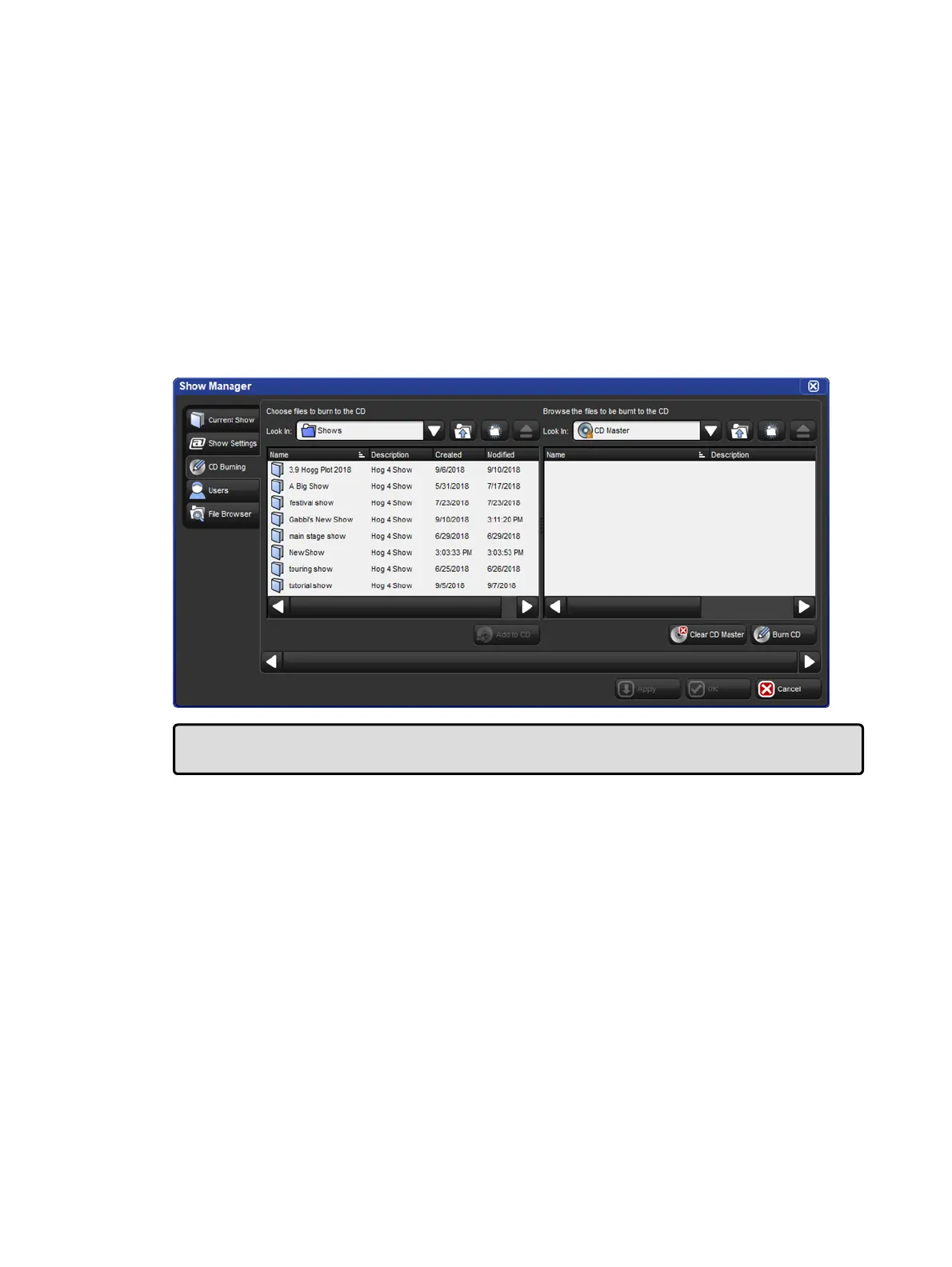 The CD Burning pane of the Show Manager