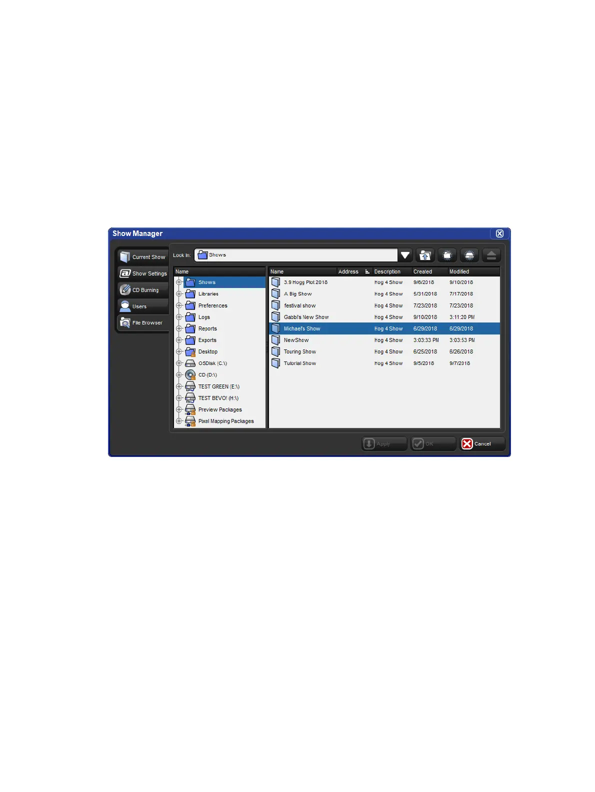 your current show file's data, or to move, copy, and delete existing shows files. Please note