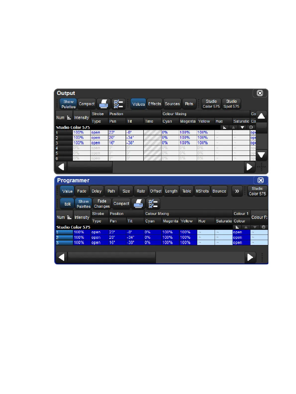 For example, if Studio Color 575s 1 to 3 are in the output with an intensity of 100%: