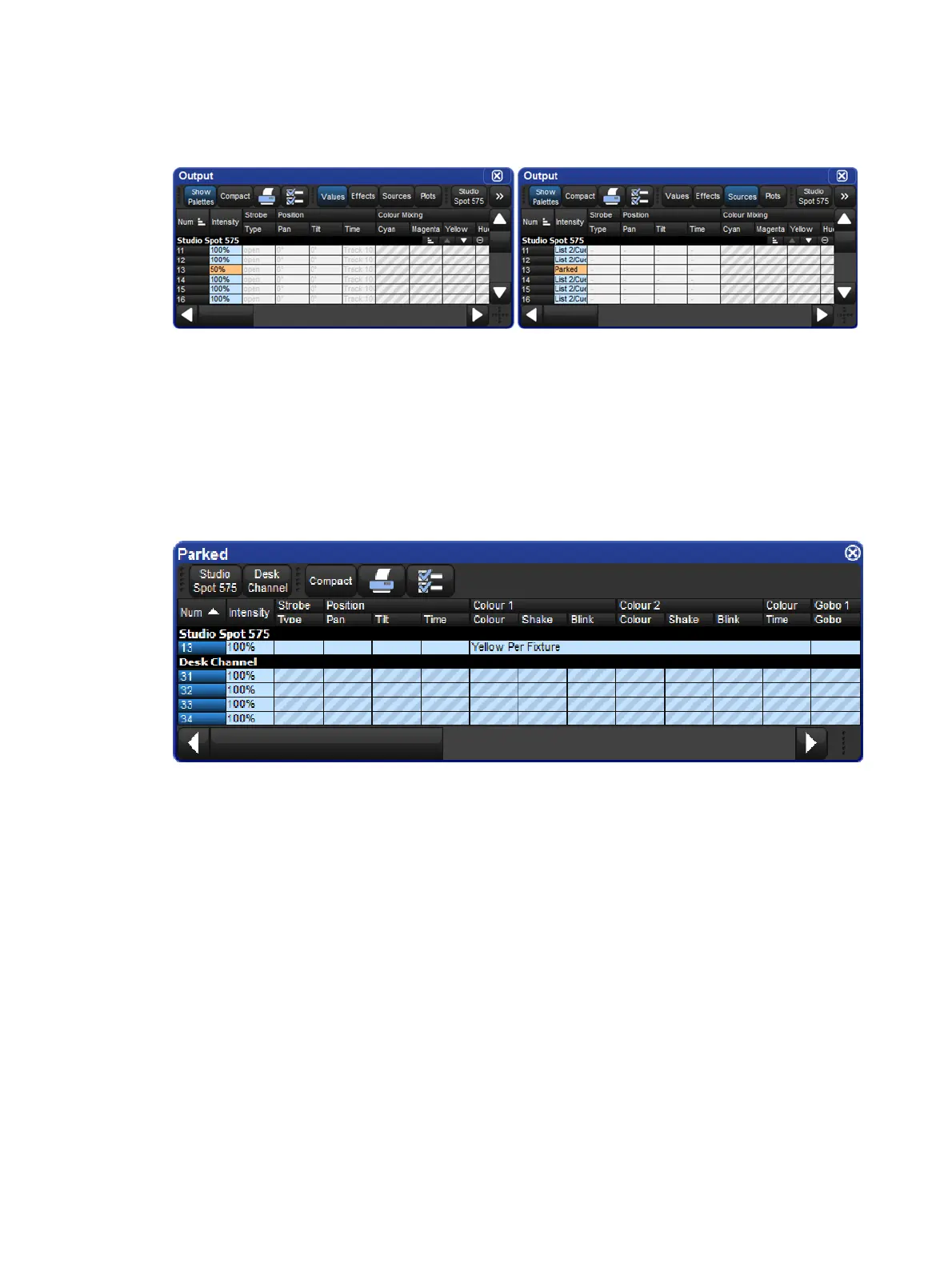 You can view and modify the parked settings of fixtures in the Parked O utput window. To