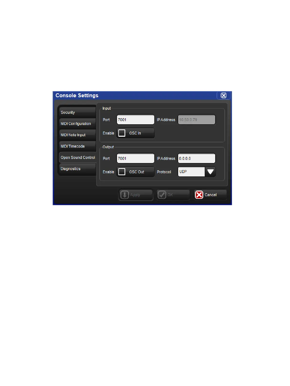 4. In the Open Sound Control pane, enable OSC O ut and assign the output port to match