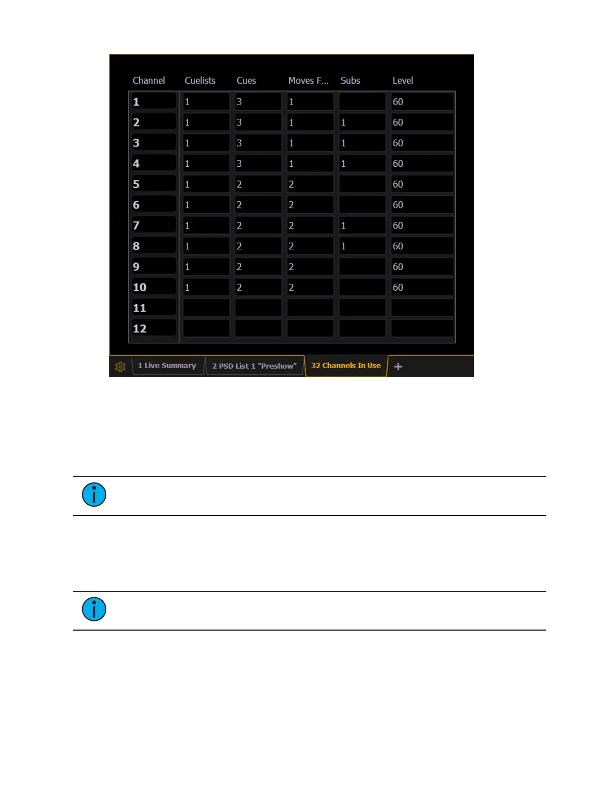 Number of cue lists the channel appears in.