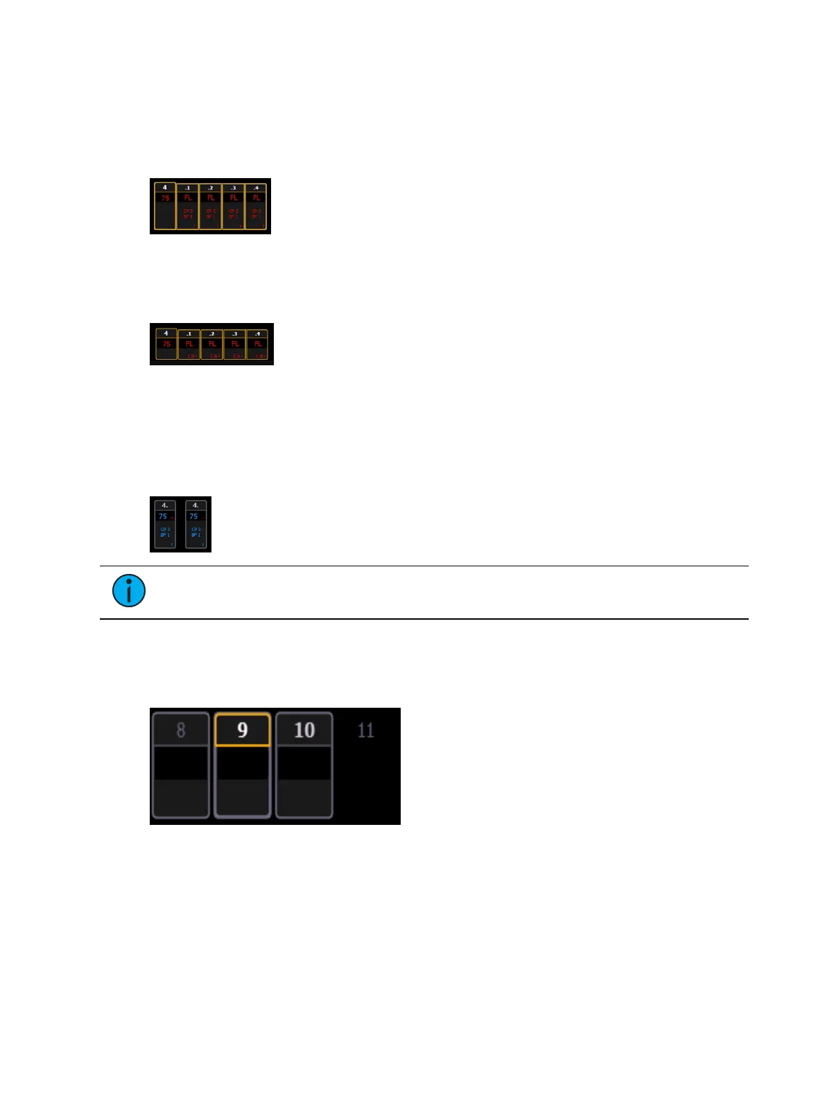 Eos uses color to indicate the selection state and information about channel/parameter levels.