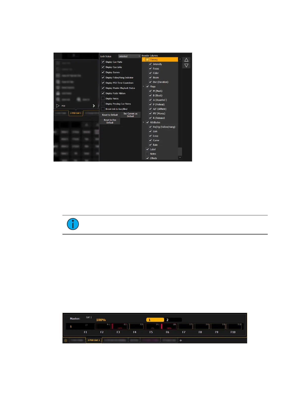 Lock Status - allows you to lock the PSD to a certain cue list. When the PSD is split, you