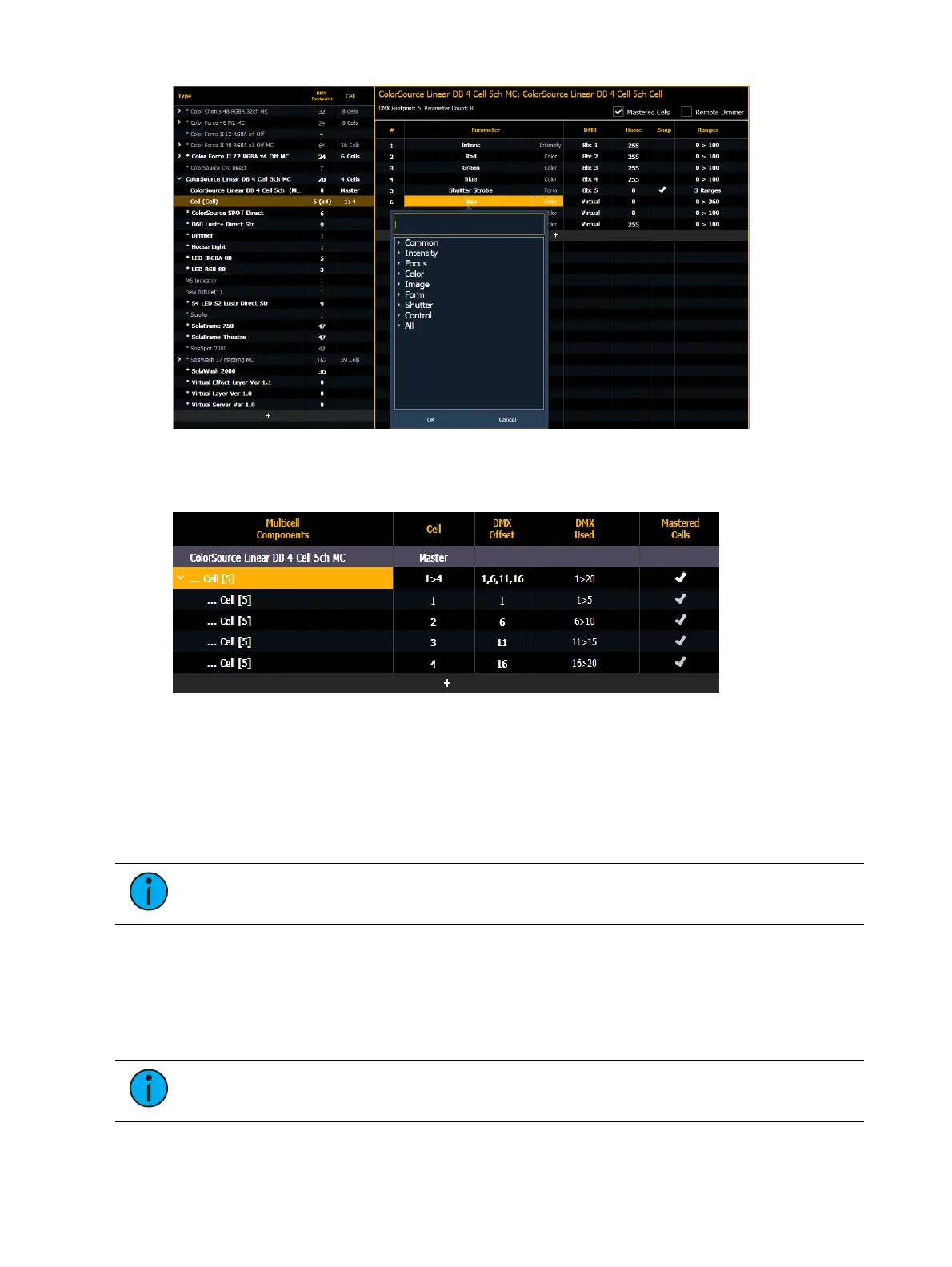 Multicell window, you can edit cell numbers, DMX offset, and mastered cells for each cell.