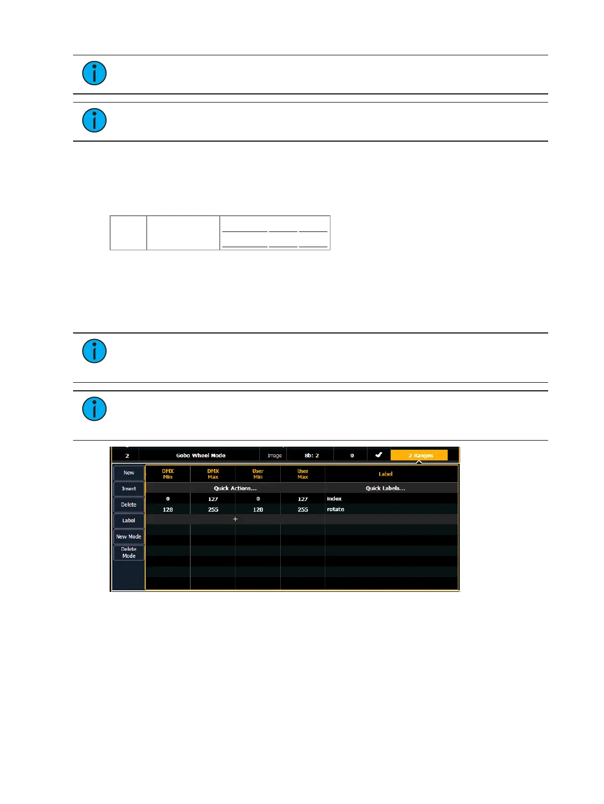 In the fixture editor, you assign a parameter as gobo wheel mode. Click in the range column to